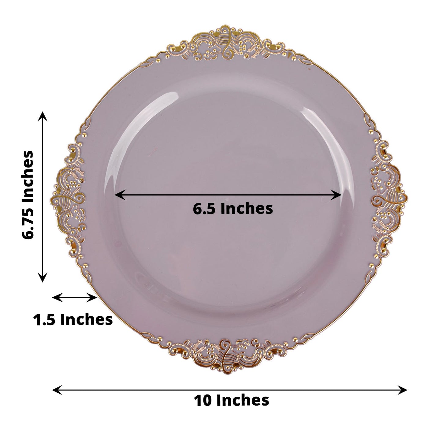 10 Pack 10" Lavender Lilac Plastic Party Plates With Gold Leaf Embossed Baroque Rim, Round Disposable Dinner Plates