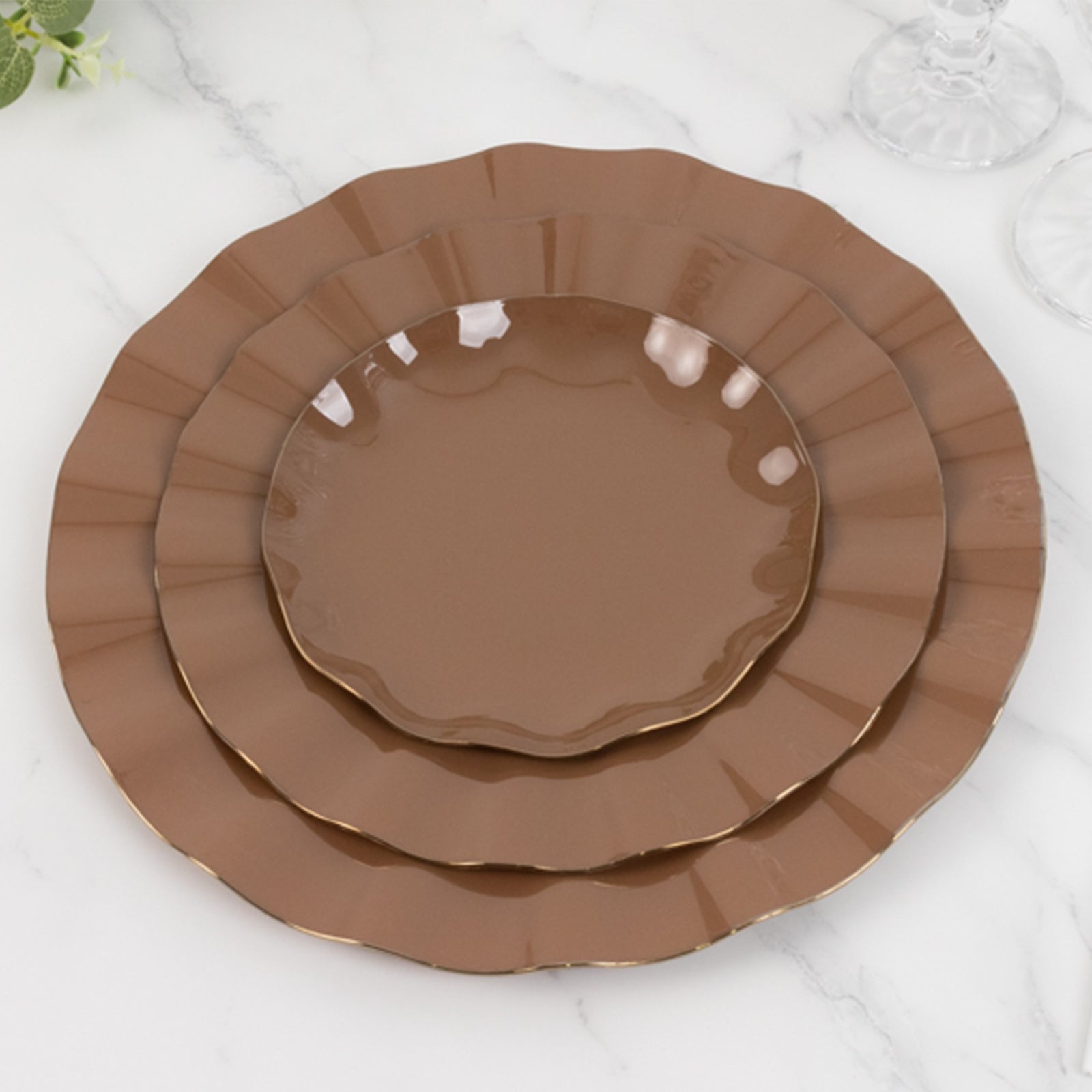 10 Pack 6" Heavy Duty Disposable Salad Plates with Gold Ruffled Rim, Coffee Brown Disposable Round Dinnerware