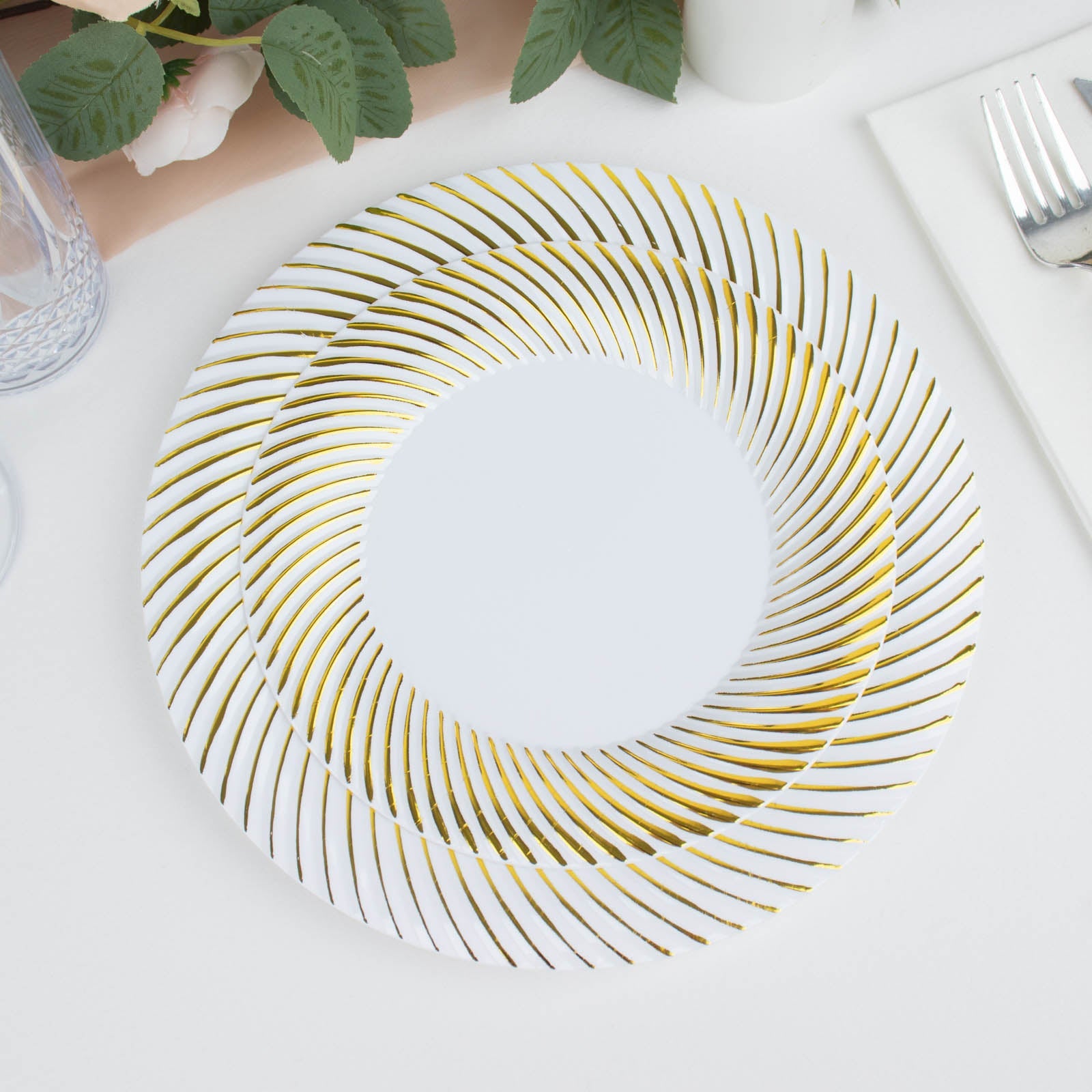 10 Pack | 7" White / Gold Swirl Rim Disposable Salad Plates, Round Plastic Dessert Appetizer Plates