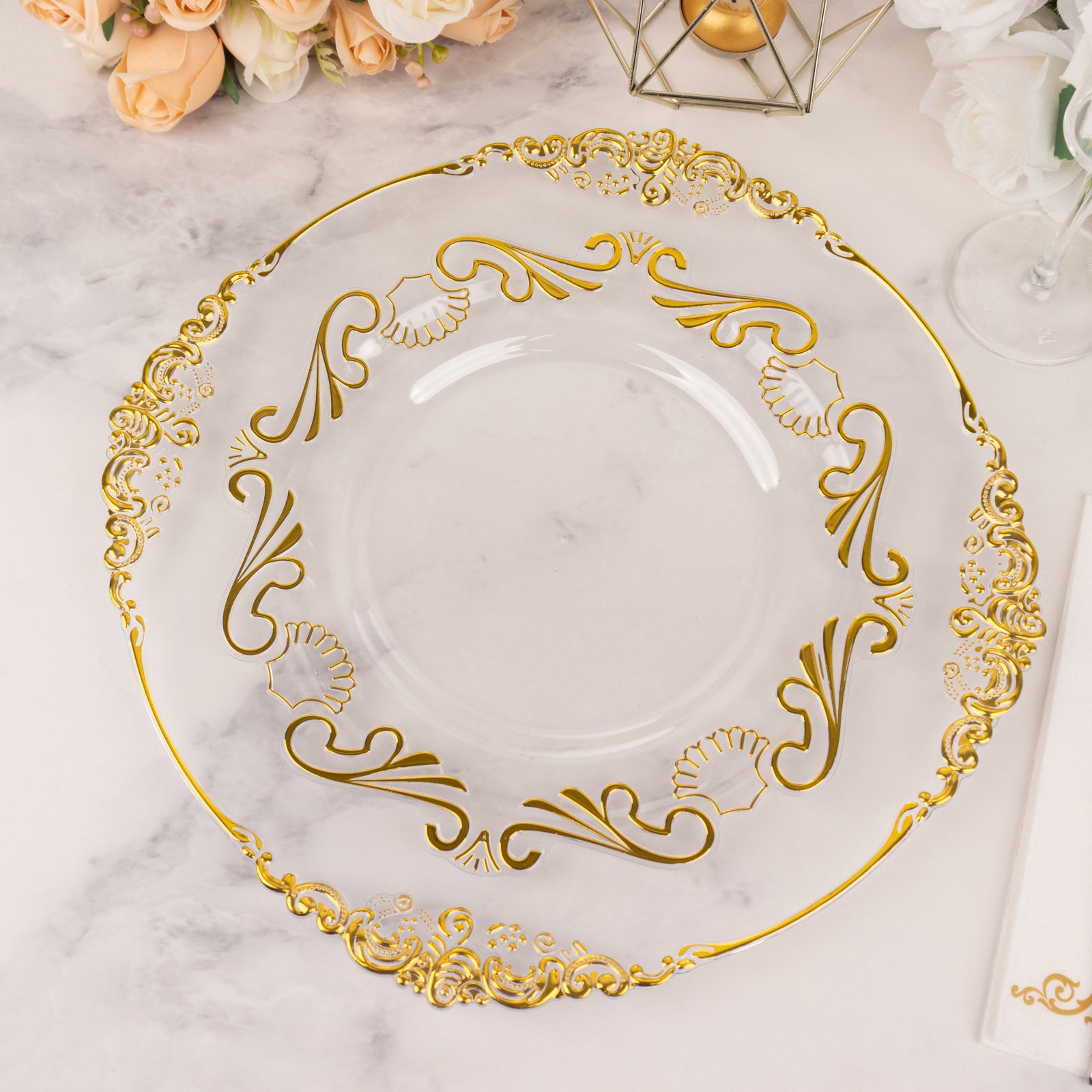 Transform your dining experience with our Clear Gold Disposable Dinner Plates. These plates feature a stunning scalloped rim that adds a touch of sophistication. The vintage baroque lace design creates an elegant ambiance, perfect for any special occasion.