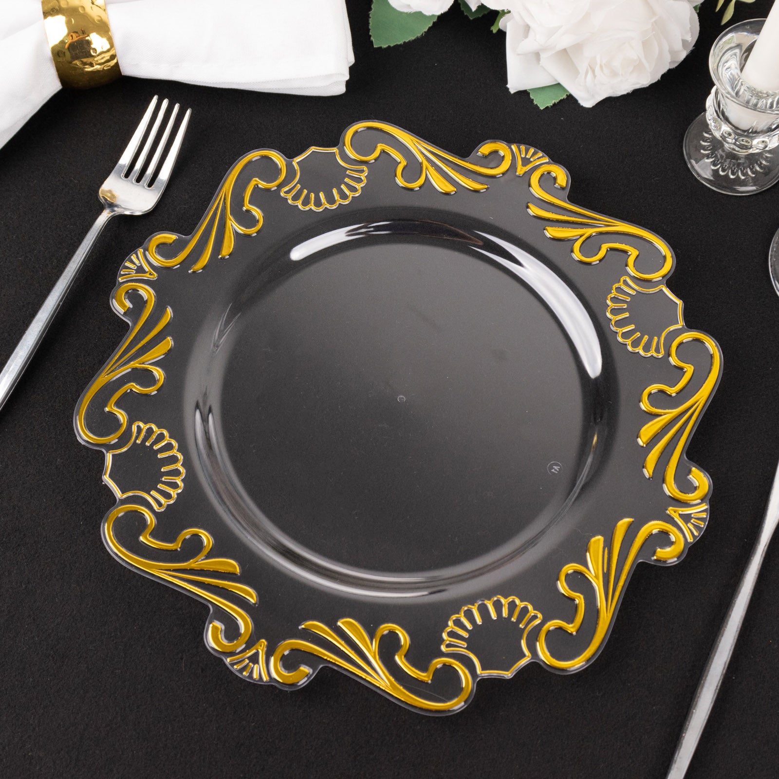 These plates pair beautifully with various table settings. Whether you’re using satin and rosette tablecloths or burlap lace table runners, they enhance the overall look. The clear and gold combination adds a touch of glamour to any table arrangement.