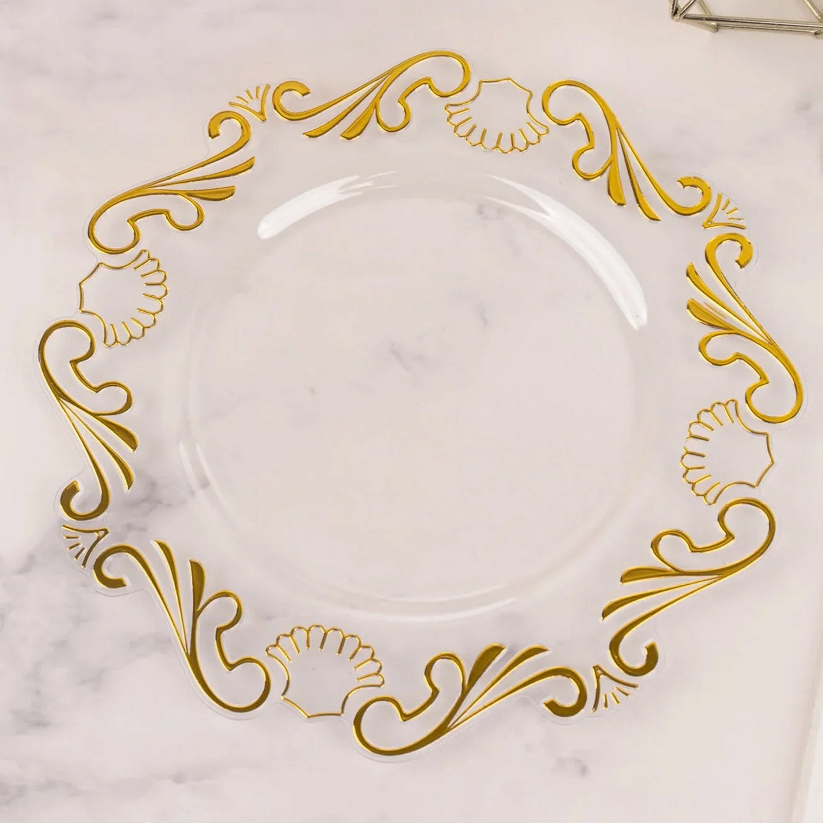 10 Pack Clear Gold European Style Disposable Dinner Plates With Scalloped Rim, Vintage Baroque Plastic Party Plates - 10"