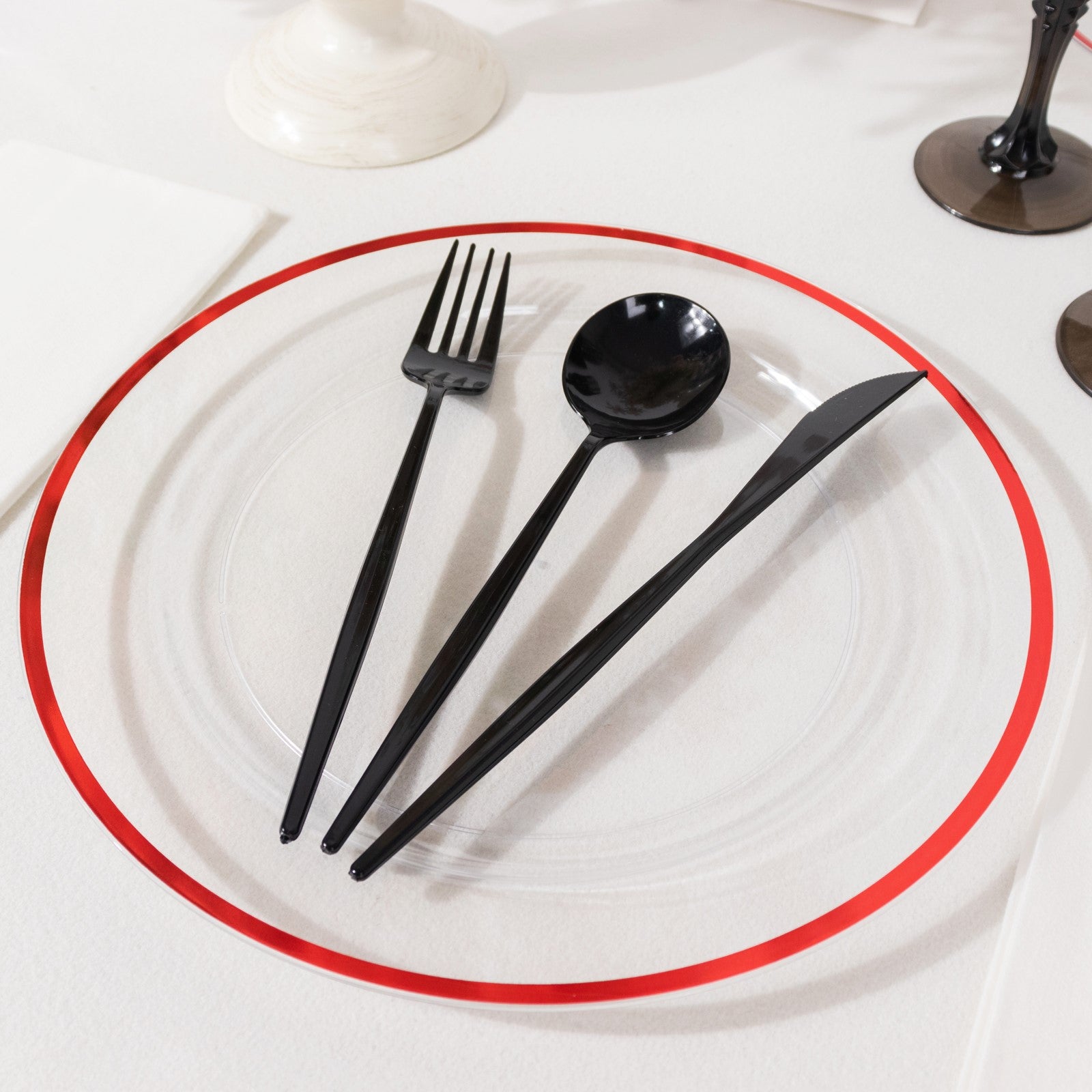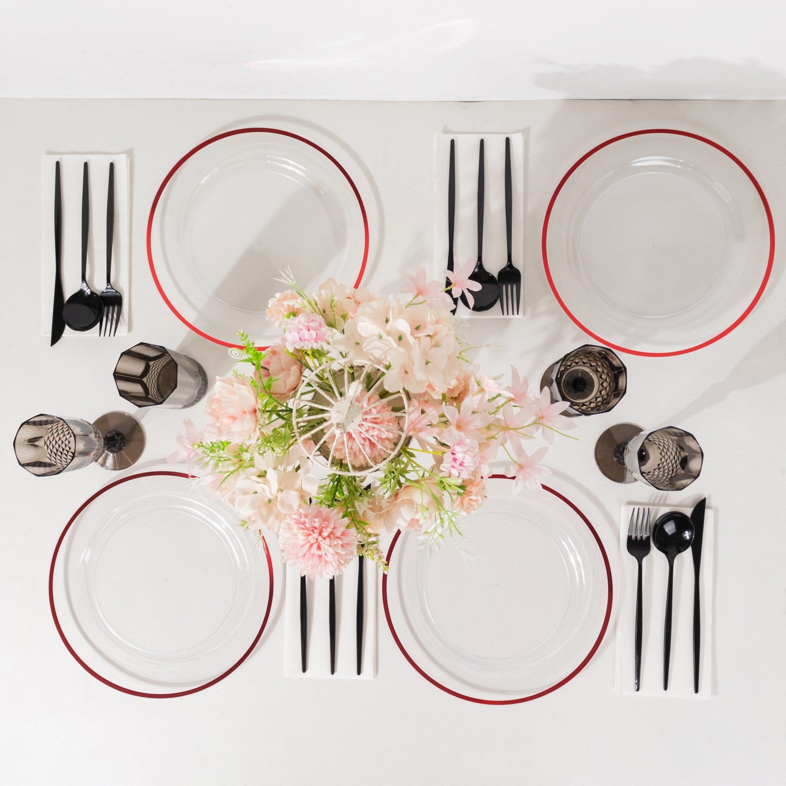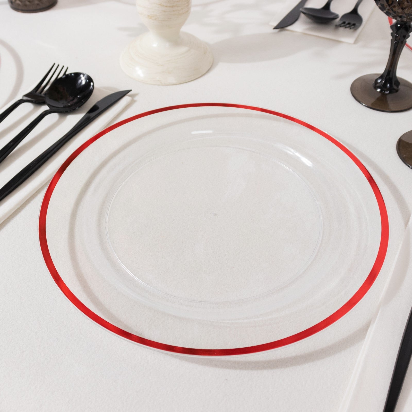 Using our clear regal disposable party plates can enhance your event decor. Pair them with colorful tablecloths for a striking contrast. The red rims will pop against various colors, adding elegance to your table settings.
