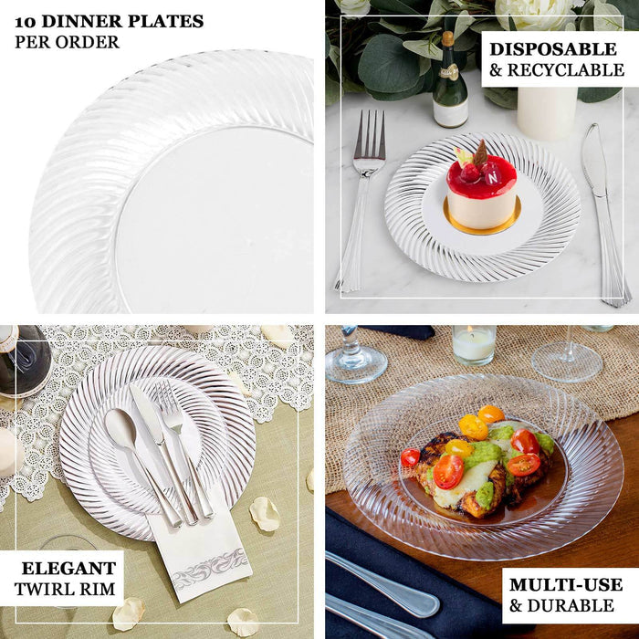 10 Pack White Plastic Party Plates with Silver Swirl Rim, 9" Round Disposable Dinner Plates