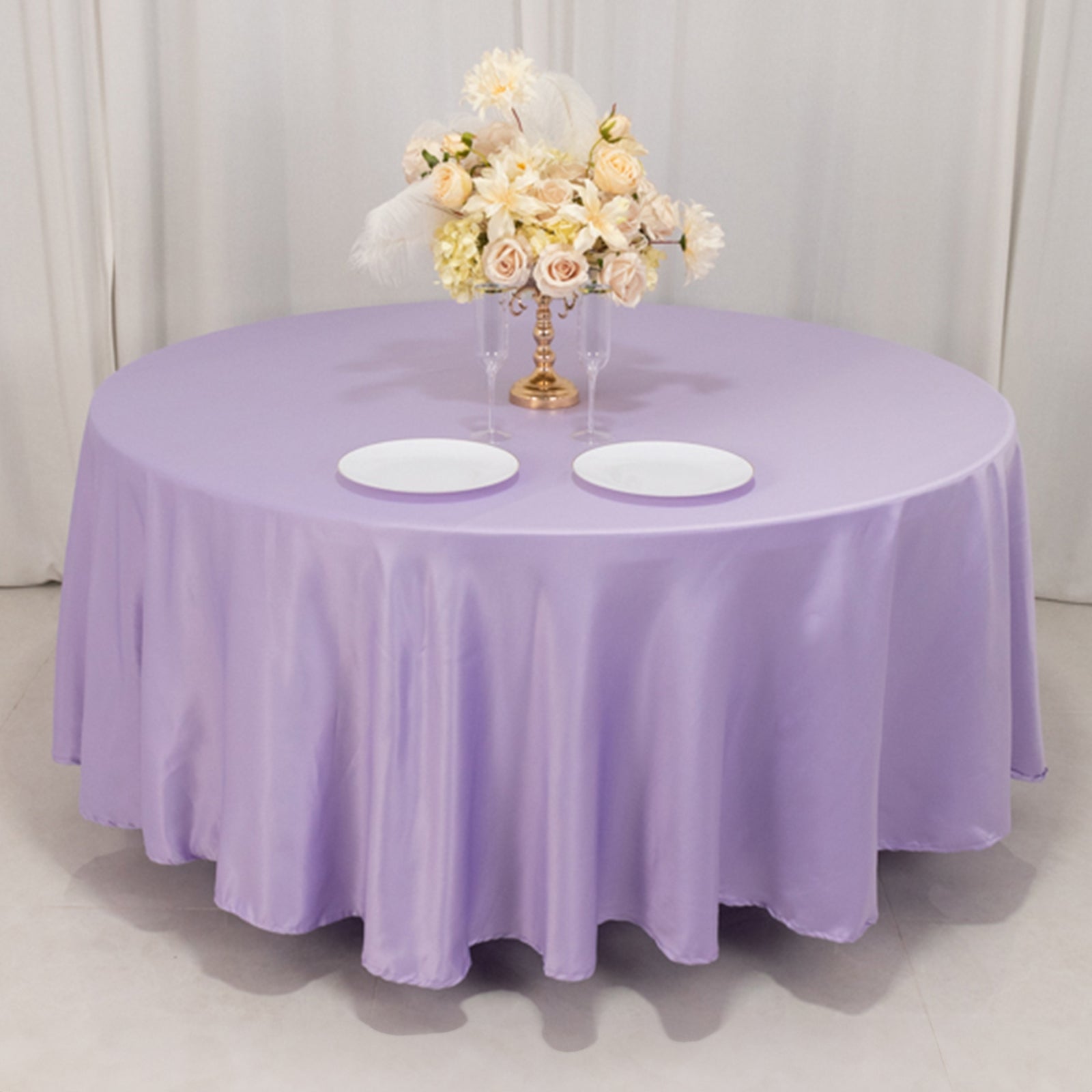 This tablecloth’s 108-inch diameter covers a variety of table sizes, making it perfect for layering with coordinating table overlays or table runners for added depth and style. It’s also easy to handle and care for, ensuring your setup looks polished from start to finish. With its combination of beauty, functionality, and versatility, the Lavender Lilac Lamour Satin Tablecloth is a must-have for any event where you want to impress.