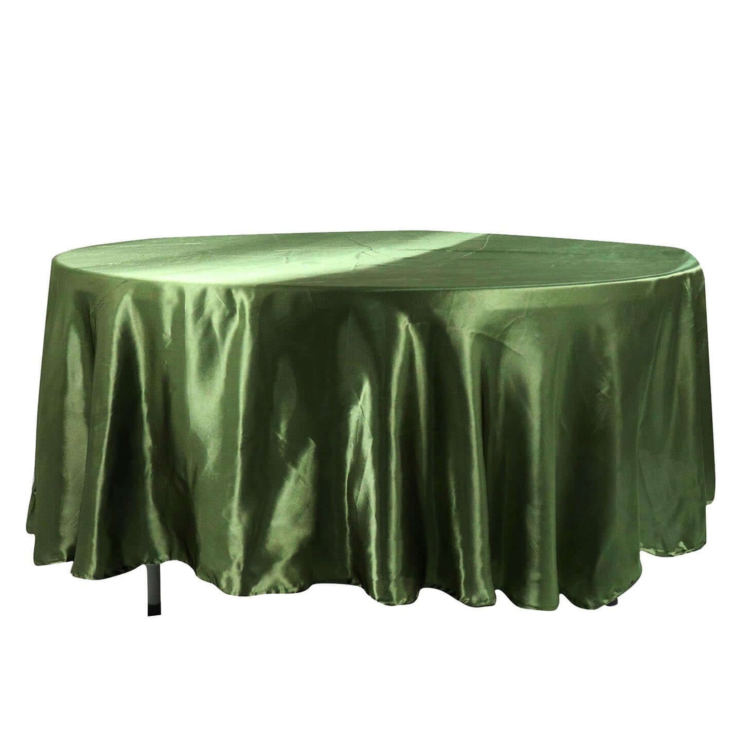 The 108" Seamless Satin Round Tablecloth in Olive Green offers a luxurious satin finish. This tablecloth transforms any table into a stunning focal point. Its rich color and smooth texture create an elegant ambiance for your event.