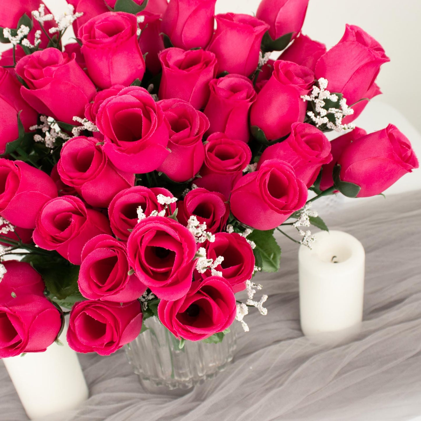 Fuchsia silk rose bud bouquets can elevate your event décor. Use them as table centerpieces for a pop of color. Their vibrant hues create a warm and inviting atmosphere.
