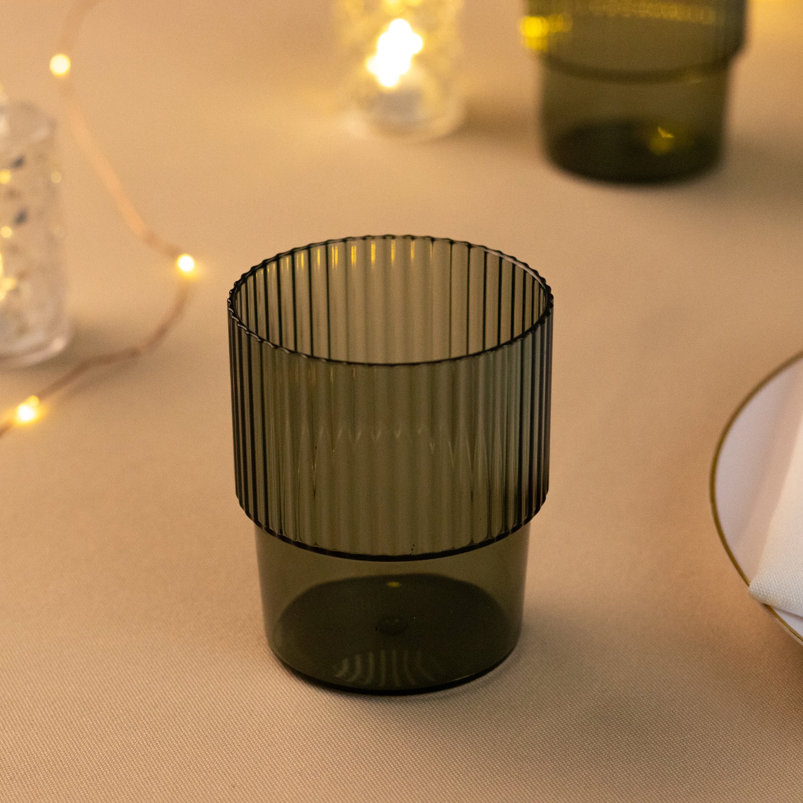 For an outdoor event, imagine these tumblers against the backdrop of natural greenery. Paired with natural elements like wood slices and greenery garlands, they create a harmonious setup that feels both organic and chic. Their ribbed texture adds dimension to the table, bringing a sense of vintage elegance that complements floral décor. Incorporate lighting elements like string lights to enhance the ambiance, creating a warm, inviting atmosphere for guests.