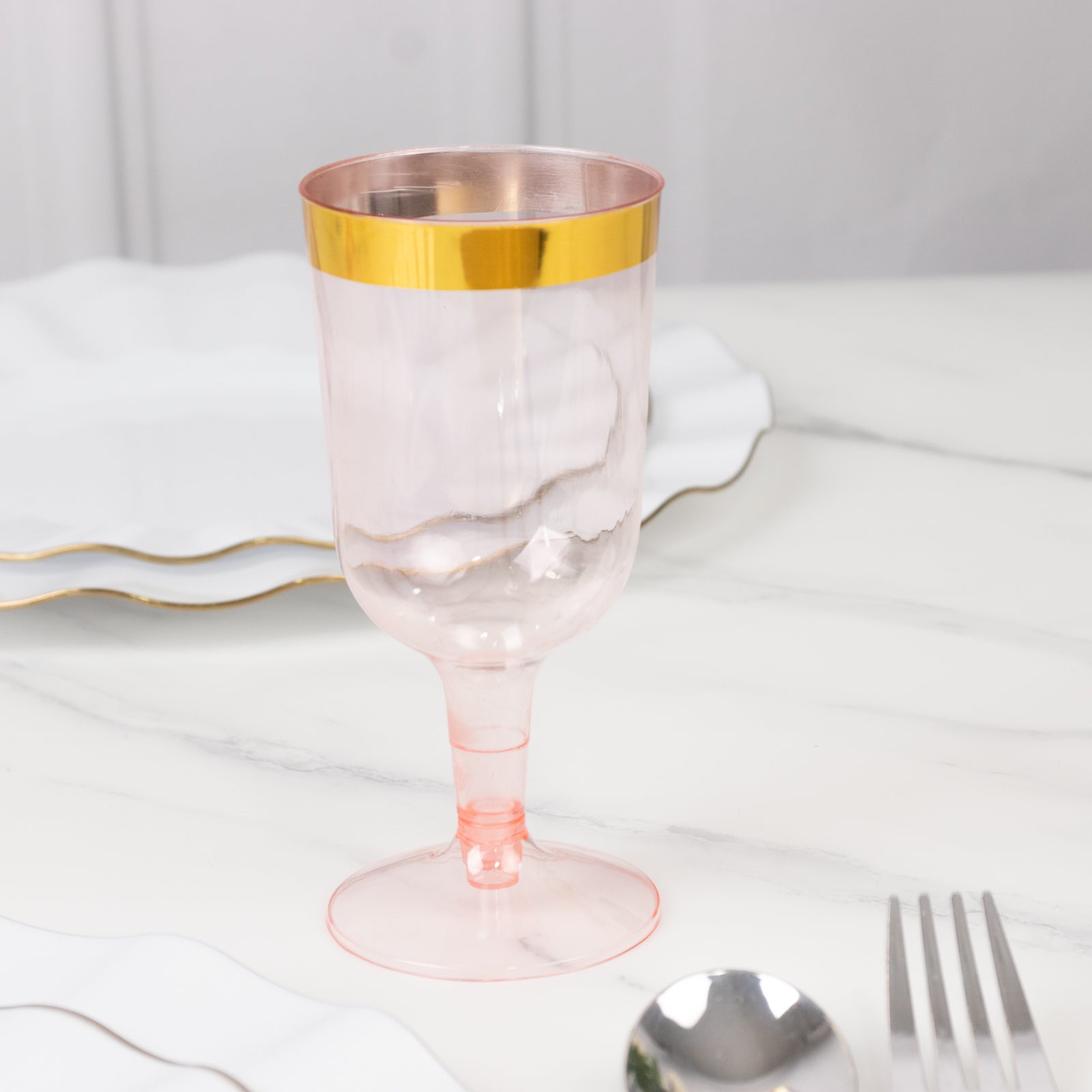 12 Pack Plastic Short Stem Wine Glasses Transparent Blush/Gold Rim - Stylish Disposable Drinkware 6oz