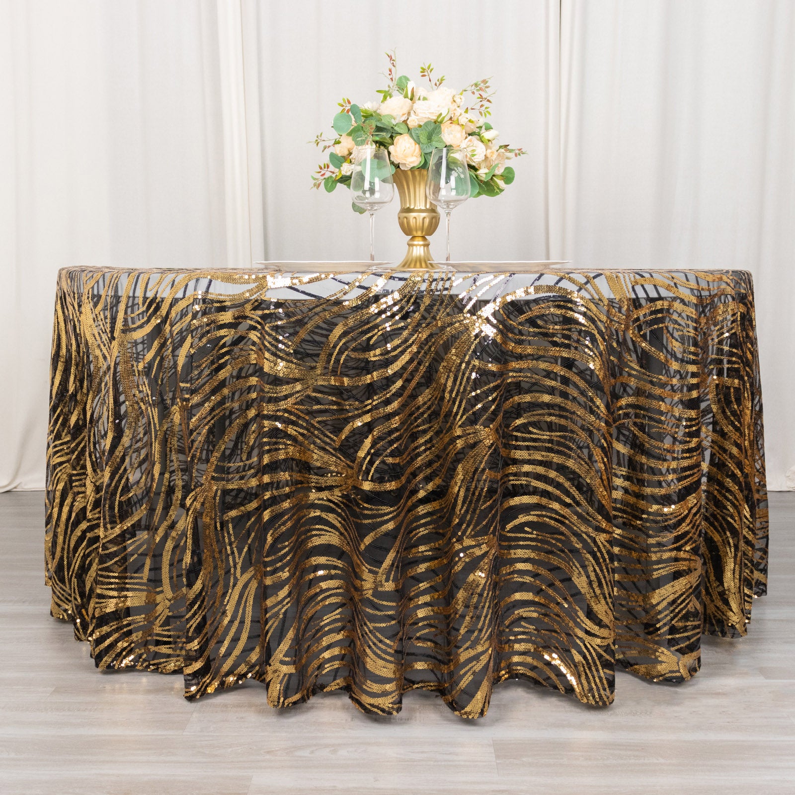 Sequin tablecloths, like the Black Gold Wave design, add instant glamour to any event. The shimmering sequins create an eye-catching focal point. They elevate even the simplest table settings into something extraordinary.
