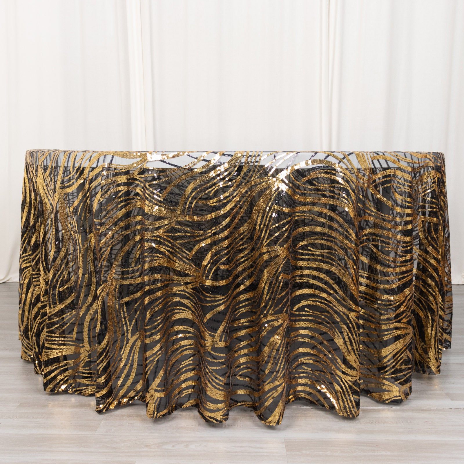 The Black Gold Wave Mesh Round Tablecloth serves as a versatile backdrop for your creativity. Use it as a foundation to build your table setting. Personalize it with centerpieces, floral arrangements, or LED lighting effects.