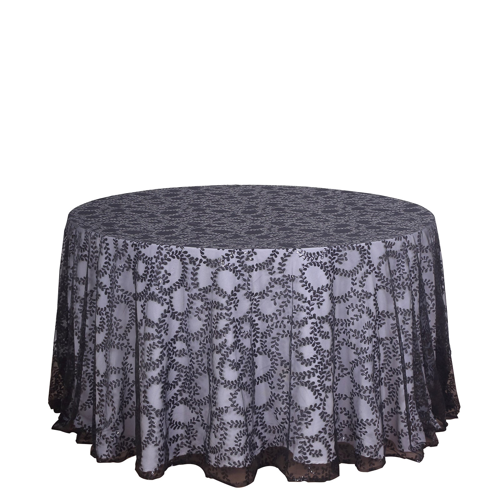 120" Black Sequin Leaf Embroidered Seamless Tulle Round Tablecloth, Sheer Table Overlay