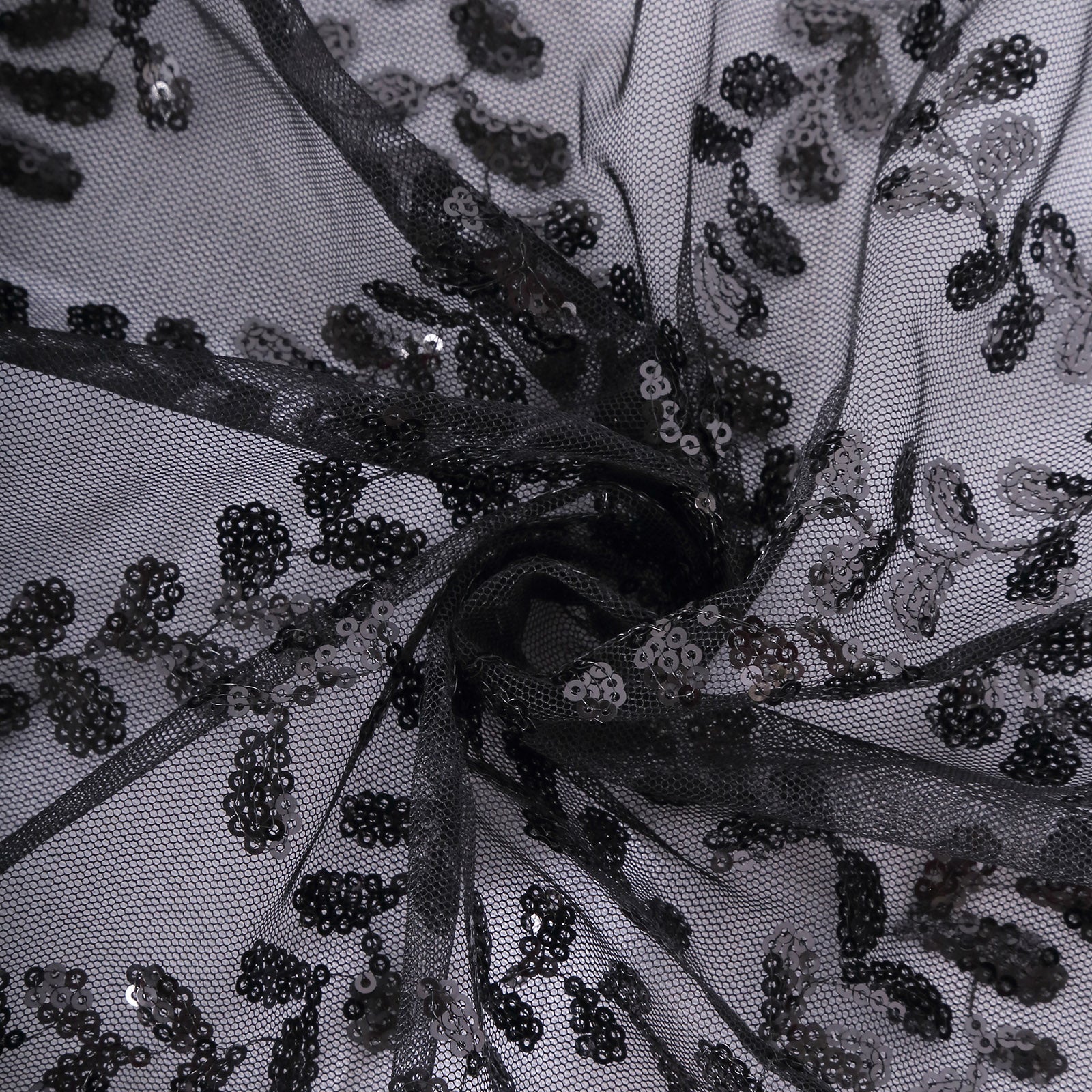 Our black sequin leaf embroidered tulle tablecloth creates stunning visuals. The shimmering sequins catch the light beautifully. This interplay of shine and sheer elegance transforms any table setting.
