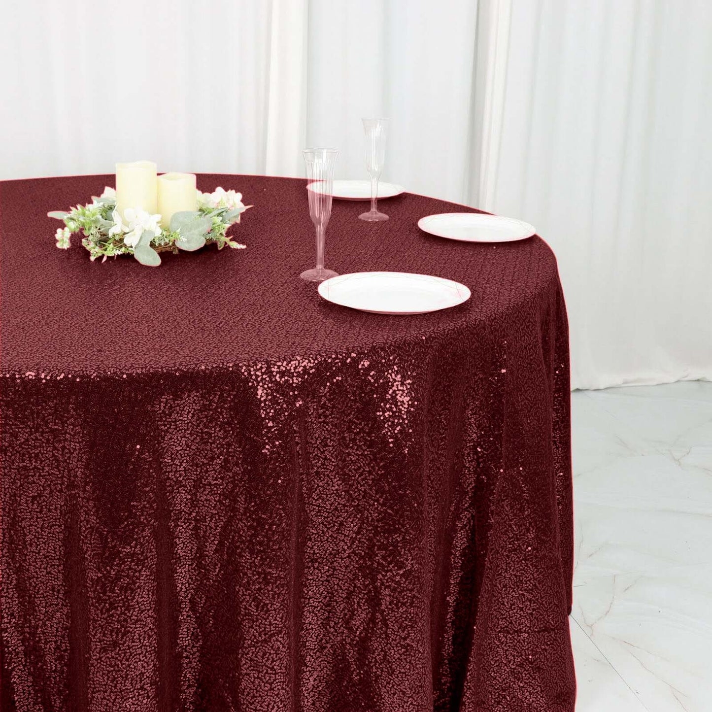 Using the 120" Burgundy Seamless Premium Sequin Round Tablecloth opens up a world of décor possibilities. It serves as a stunning base for your table settings. Consider pairing it with contrasting colors for a striking visual effect.