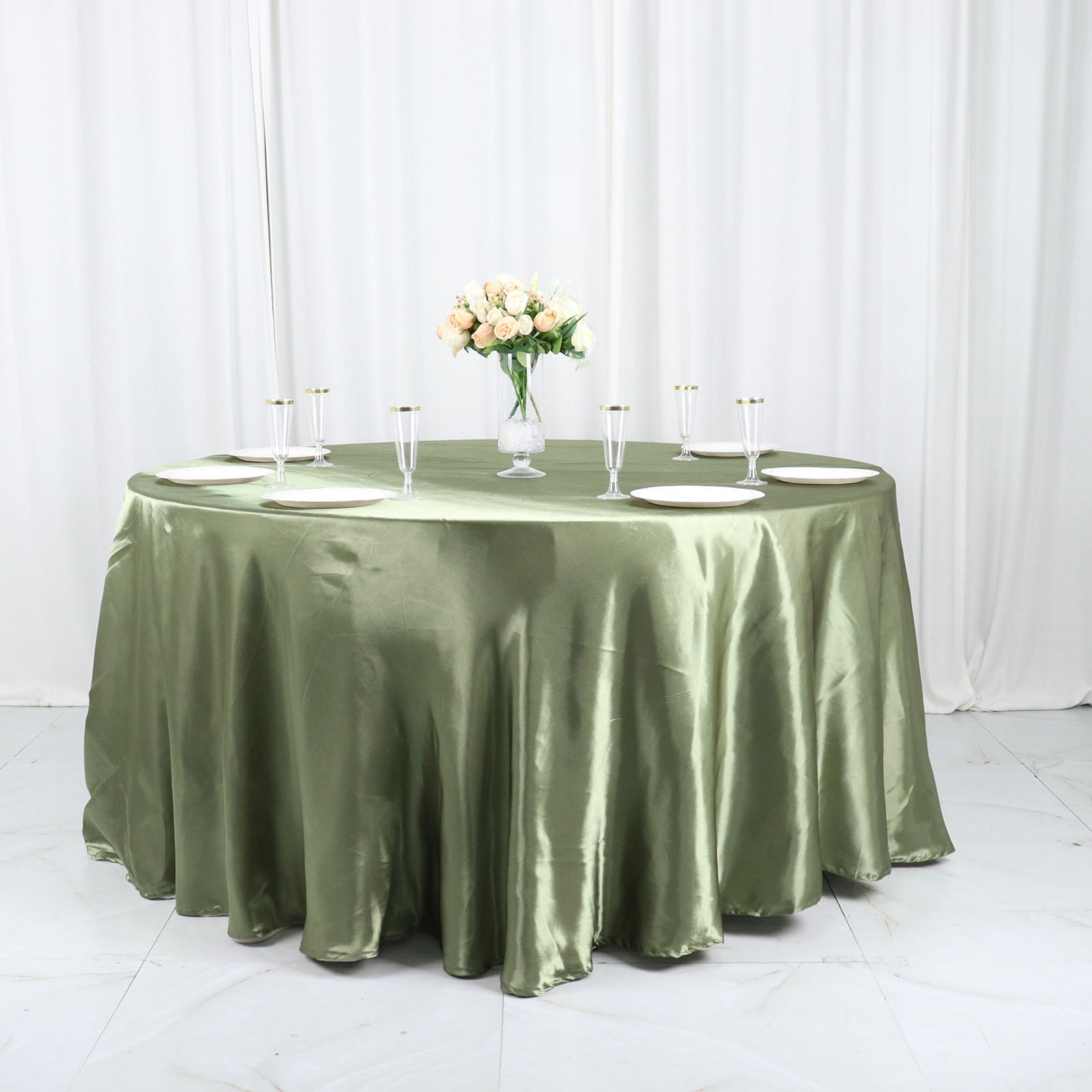 Say goodbye to disposable table linens. Choose the Dusty Sage Green Satin Round Tablecloth for sustainability. Enjoy long-lasting elegance that enhances every gathering.