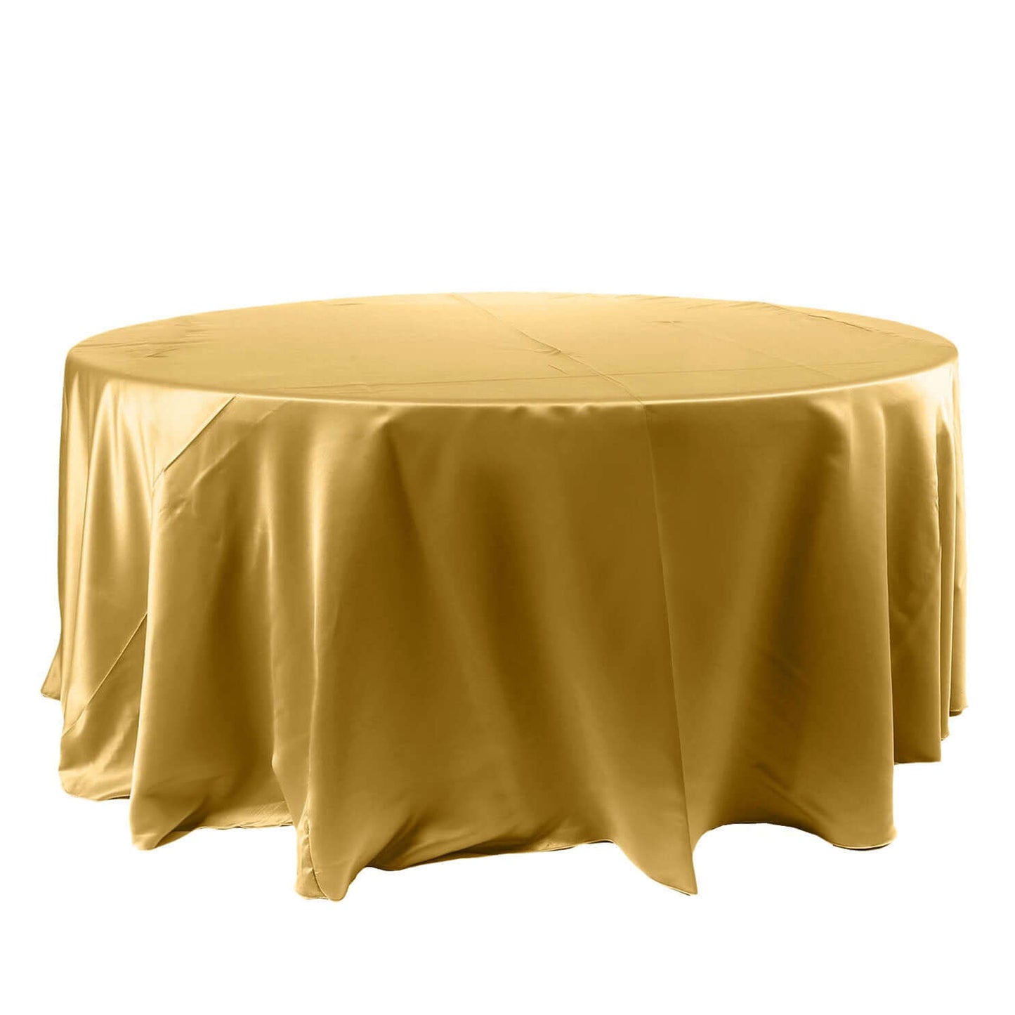 The 120" Gold Seamless Satin Round Tablecloth offers a luxurious satin finish. Its silky texture enhances any table setting. The rich gold hue radiates elegance and sophistication, making it perfect for upscale events.