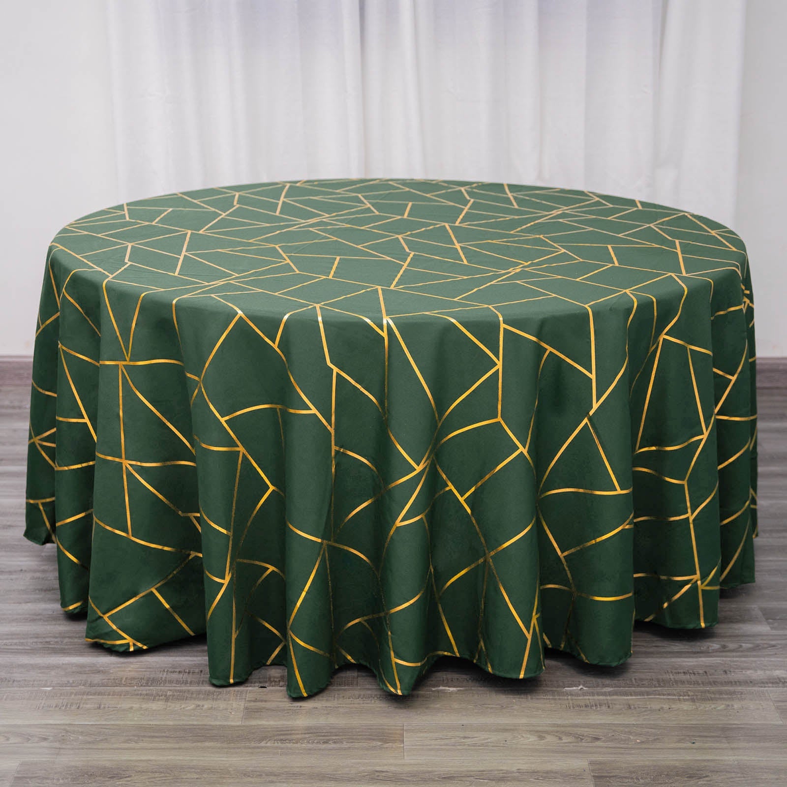 The 120" Hunter Emerald Green Seamless Round Polyester Tablecloth is stunning. Its rich emerald hue adds luxury to any setting. The gold foil geometric pattern enhances its elegance, creating a captivating focal point.