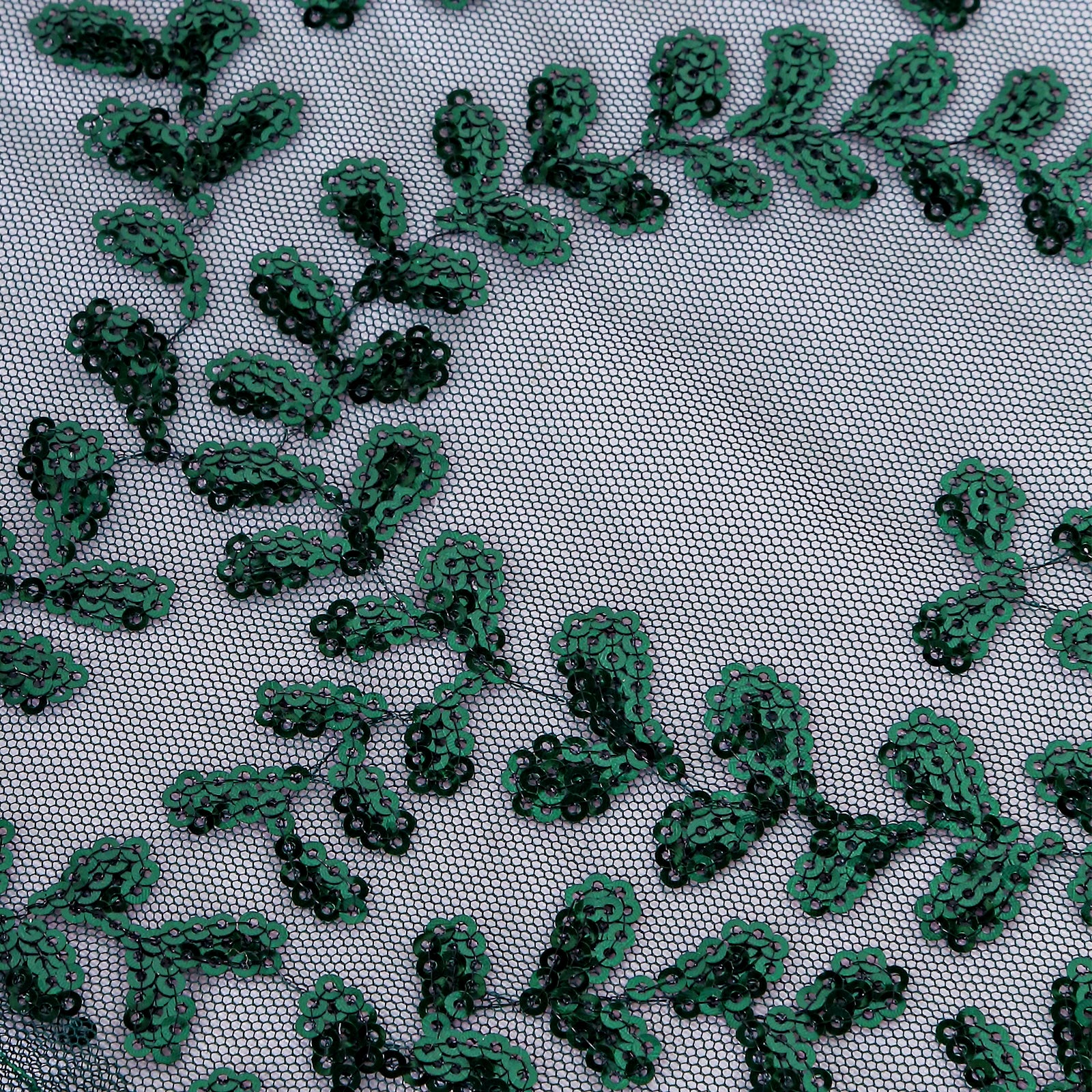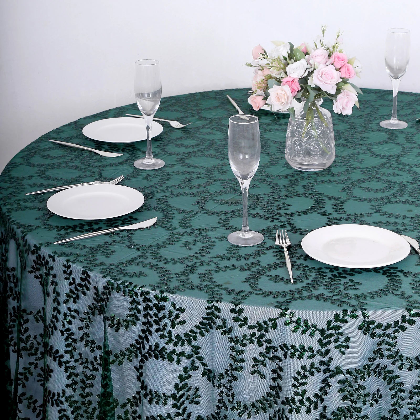 120" Hunter Emerald Green Sequin Leaf Embroidered Seamless Tulle Round Tablecloth, Sheer Table Overlay