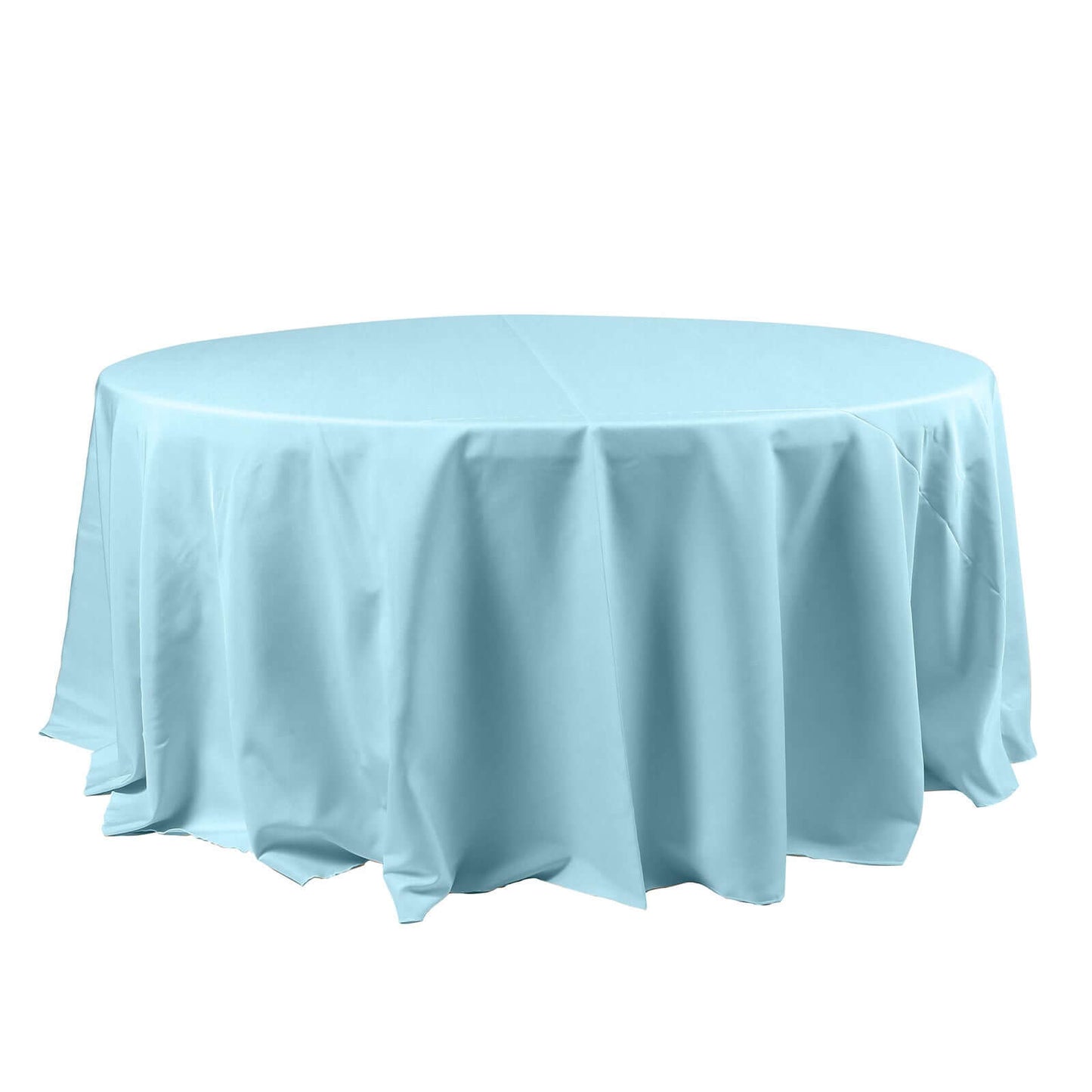 The versatility of the 120" Blue Seamless Polyester Round Tablecloth is unmatched. Ideal for formal events, it also suits casual gatherings. Use it for birthday parties, baby showers, or picnics.