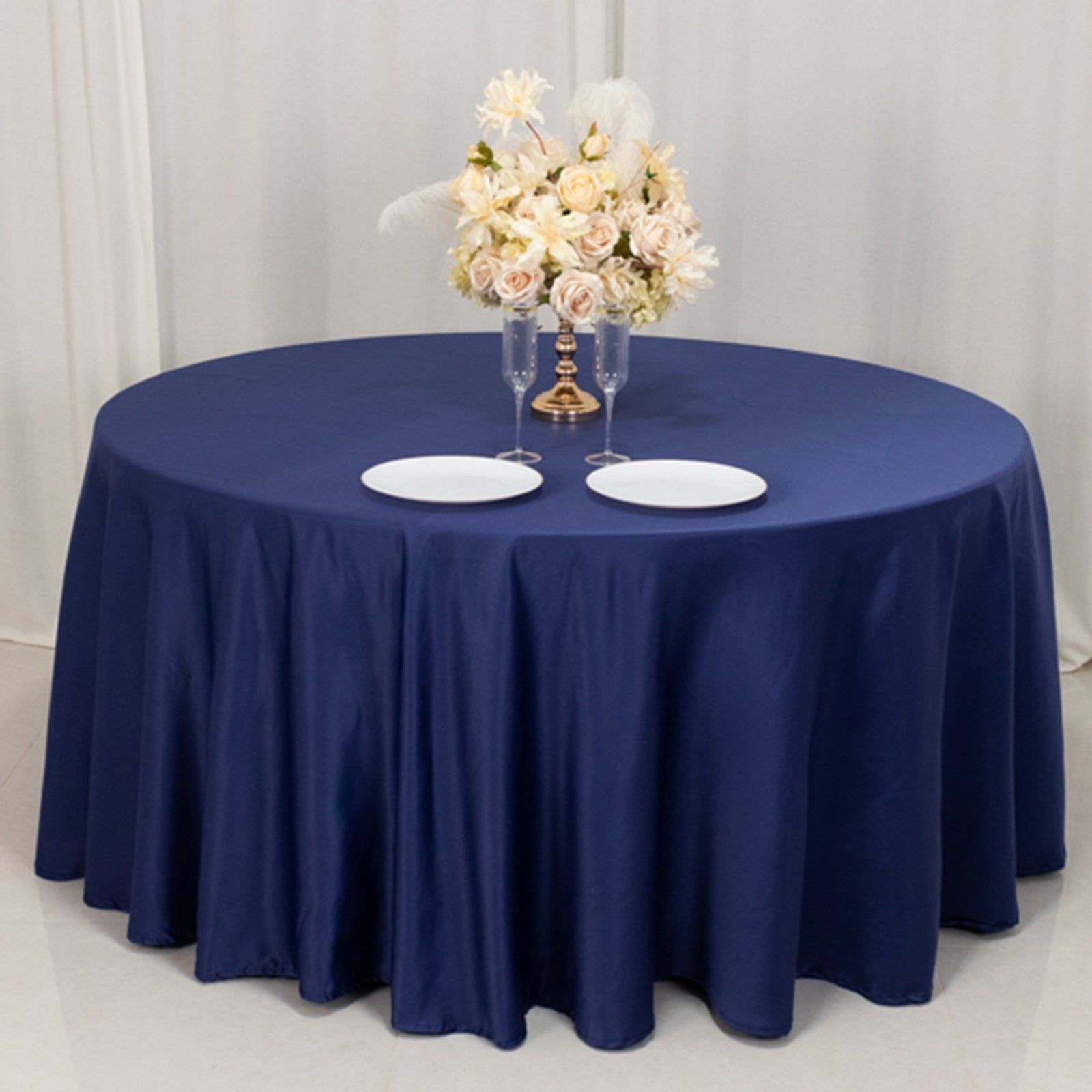 One of the standout features of this length is its versatility. Floor-length drops are ideal for grand, formal occasions like weddings and galas, as well as for upscale casual gatherings. They offer the benefit of a clean, streamlined appearance that doesn’t require additional drapery or adjustments. Imagine this satin tablecloth at a wedding reception, setting the perfect stage for the bride and groom’s head table or highlighting the cake table with a touch of Navy Blue elegance that photographs beautifully.