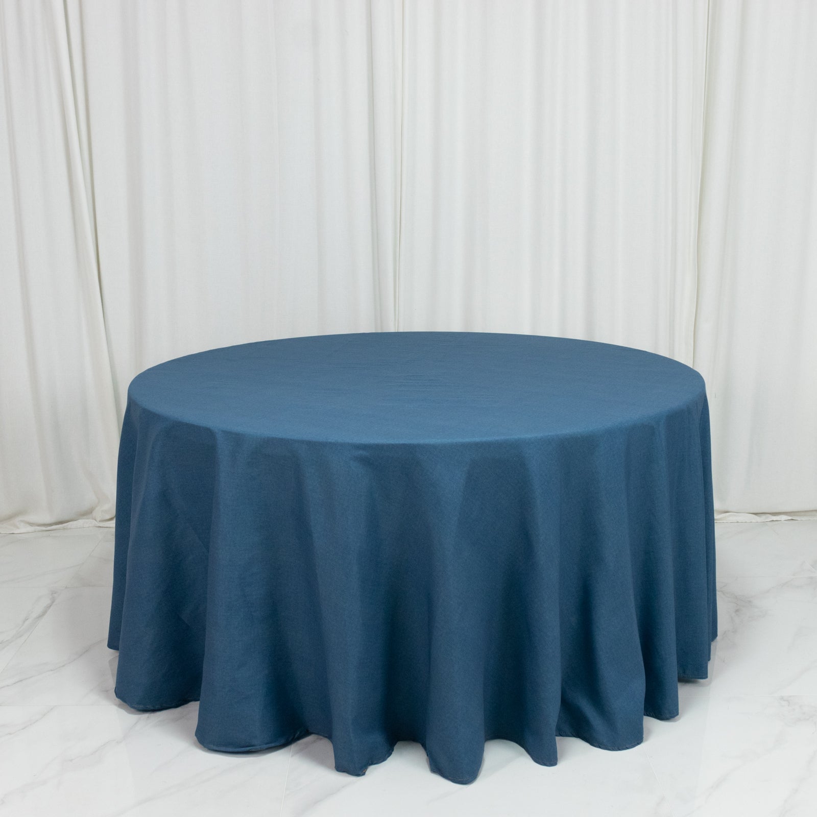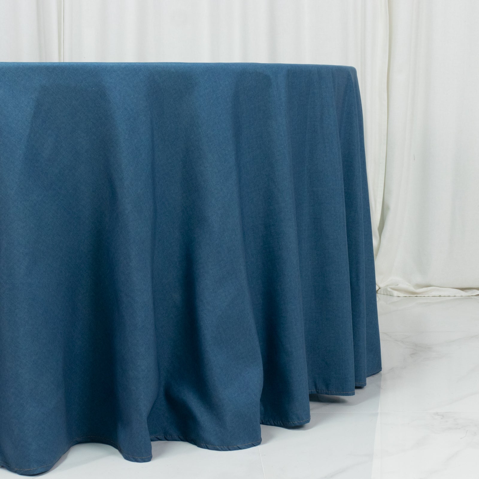 TCFLinen offers this 120 inch round tablecloth as a durable and stylish solution for modern events. Crafted from polyester with a textured faux denim design, it delivers a sophisticated foundation for weddings, receptions, and celebrations. The denim blue shade adds versatility to your décor and pairs seamlessly with floral arrangements, centerpiece stands, or metallic accents. Its seamless, one-piece design with hemmed edges ensures a polished presentation and full floor-length coverage on standard 5 ft round tables. With a weight of 95 GSM, the fabric balances easy handling and practical durability, providing a smooth and attractive table surface that remains wrinkle-free throughout setup and service.