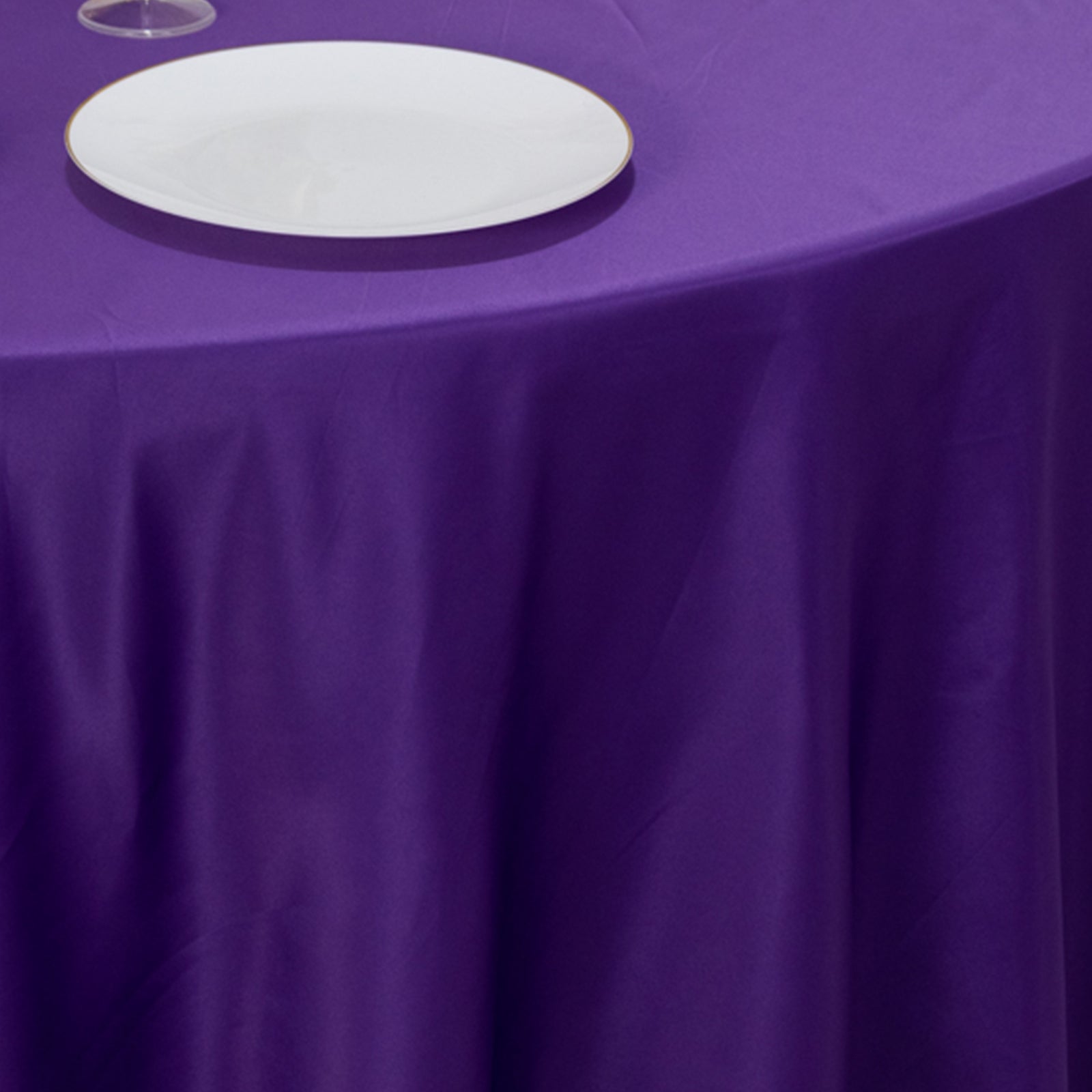 One of the standout features of this length is its versatility. Floor-length drops are ideal for grand, formal occasions like weddings and galas, as well as for upscale casual gatherings. They offer the benefit of a clean, streamlined appearance that doesn’t require additional drapery or adjustments. Imagine this satin tablecloth at a wedding reception, setting the perfect stage for the bride and groom’s head table or highlighting the cake table with a touch of Purple elegance that photographs beautifully.