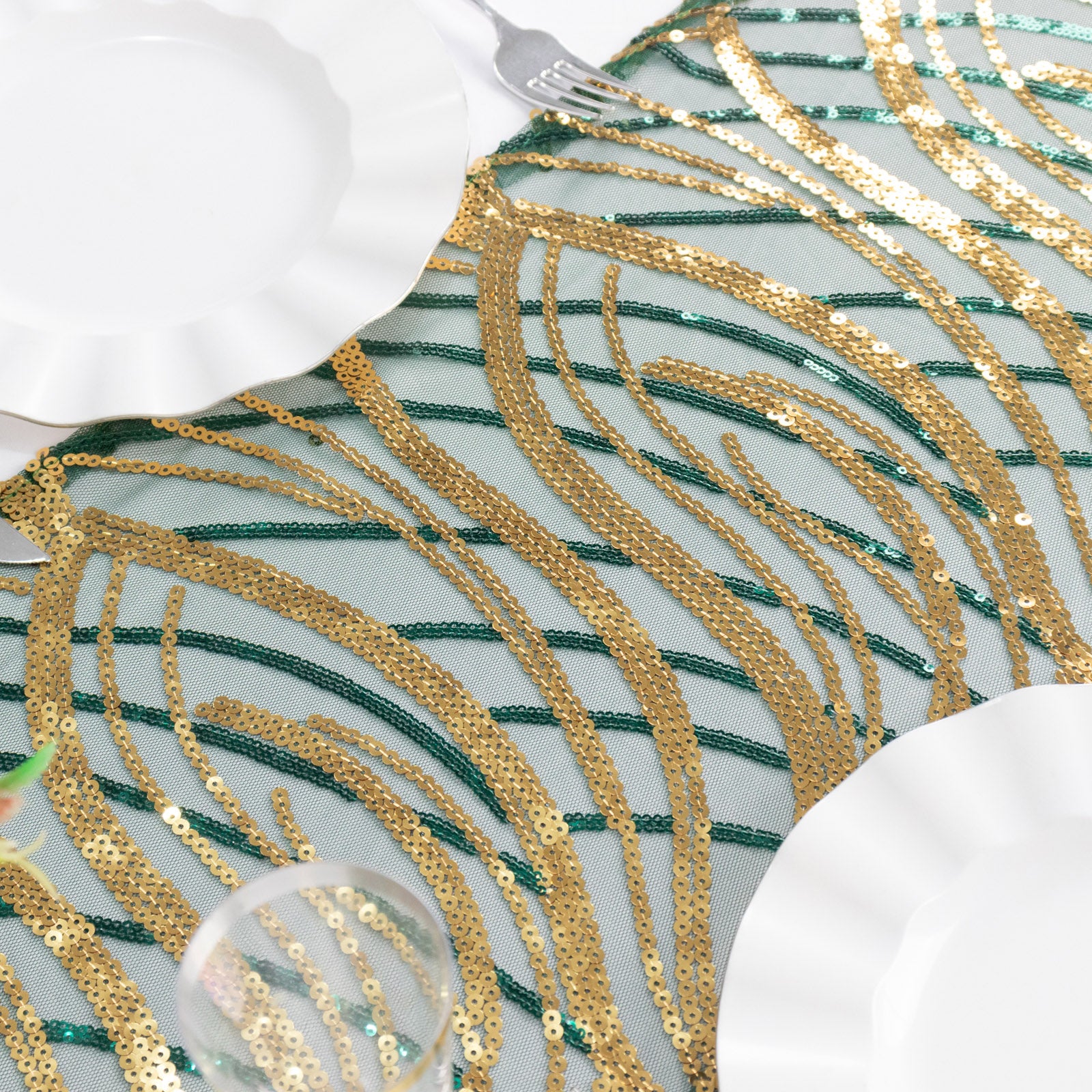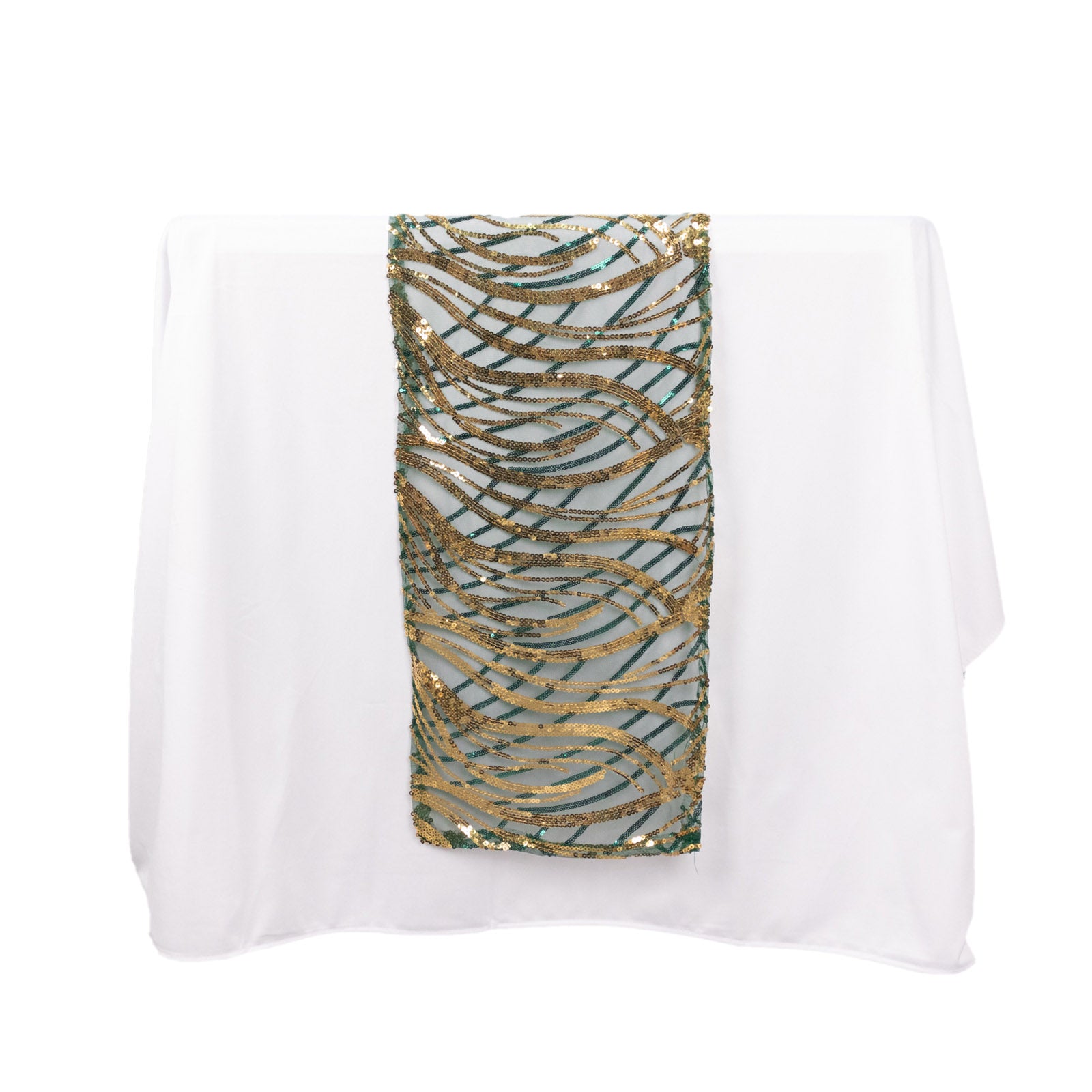 12"x108" Hunter Emerald Green Gold Wave Embroidered Sequins Table Runner