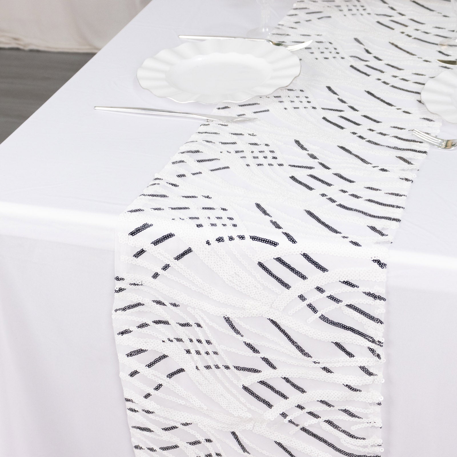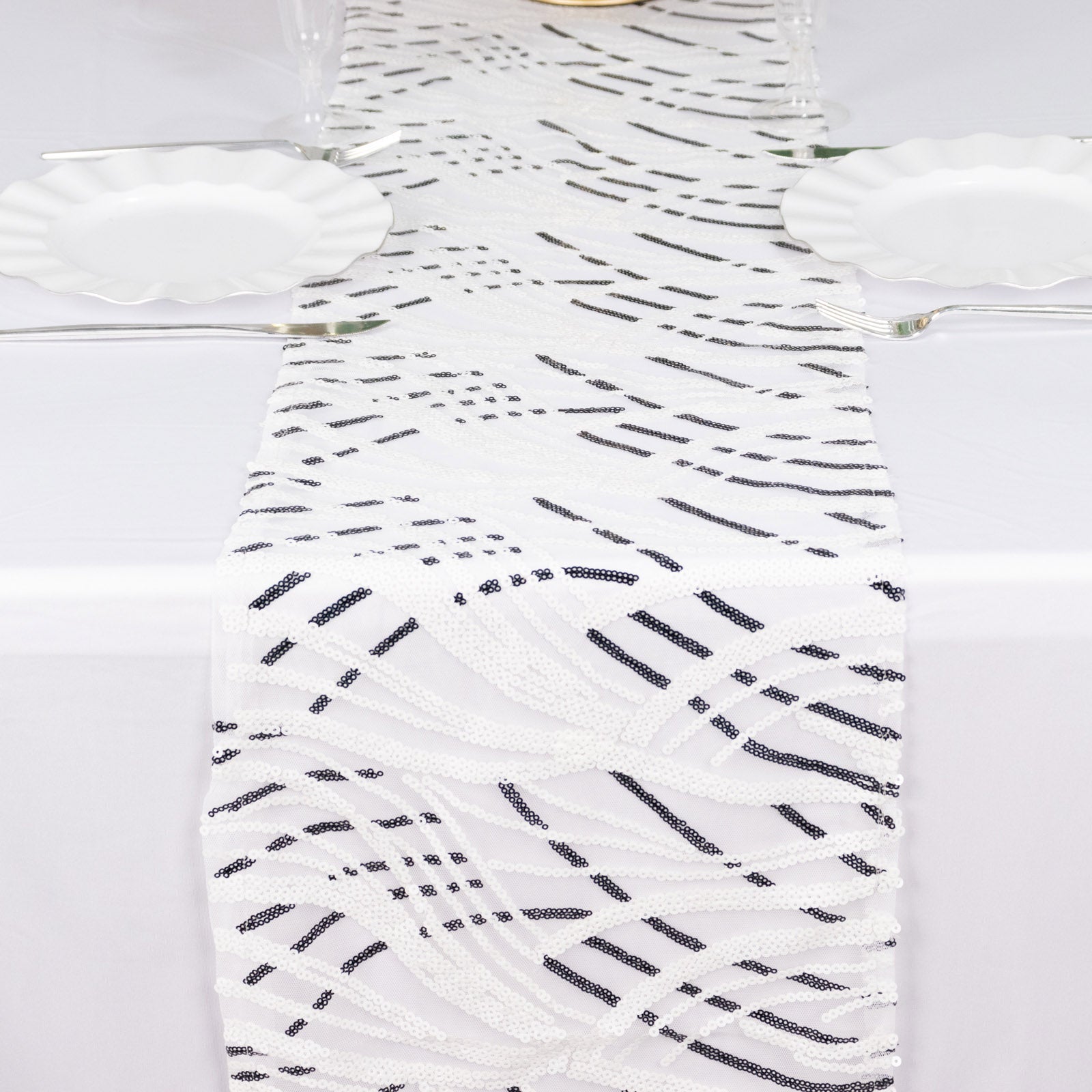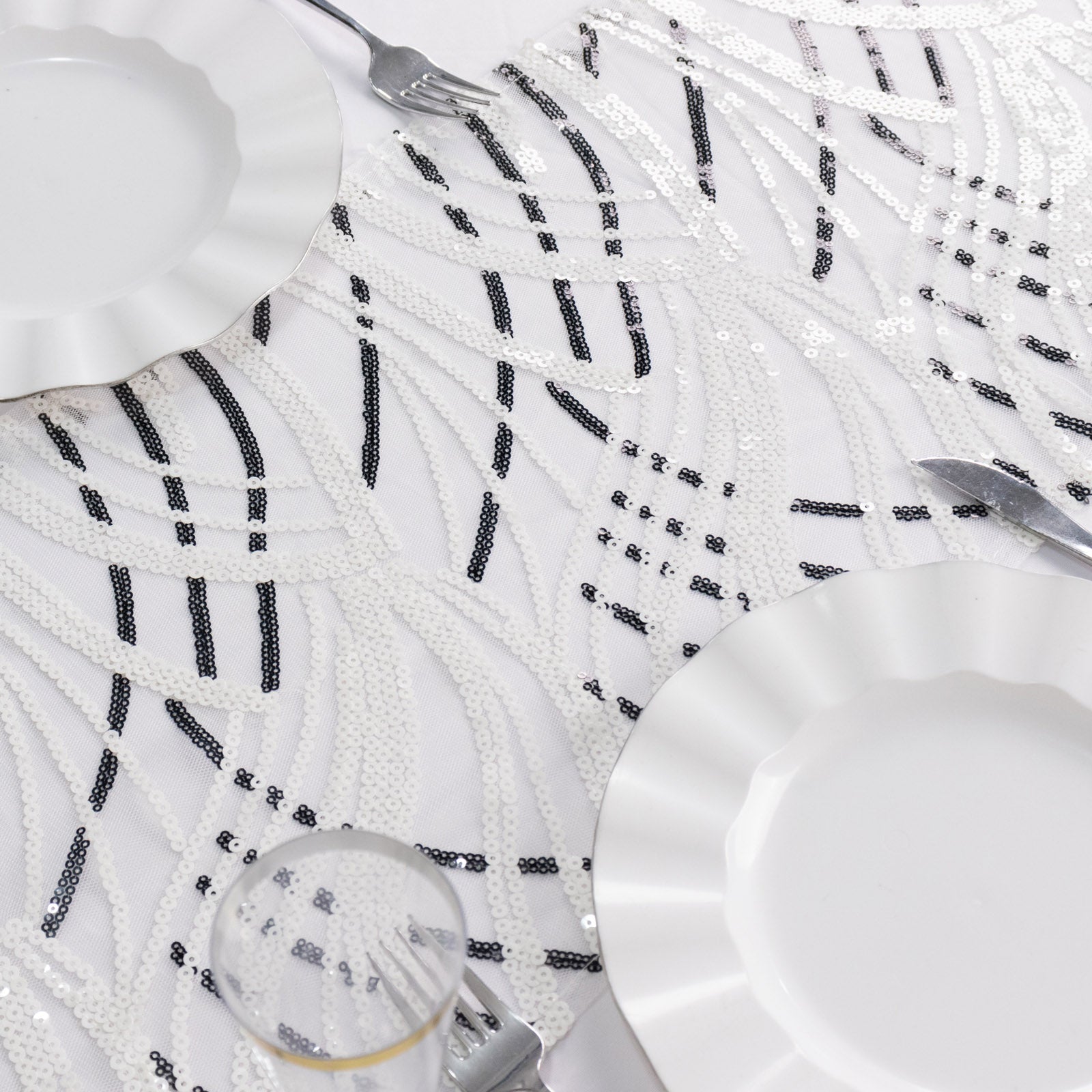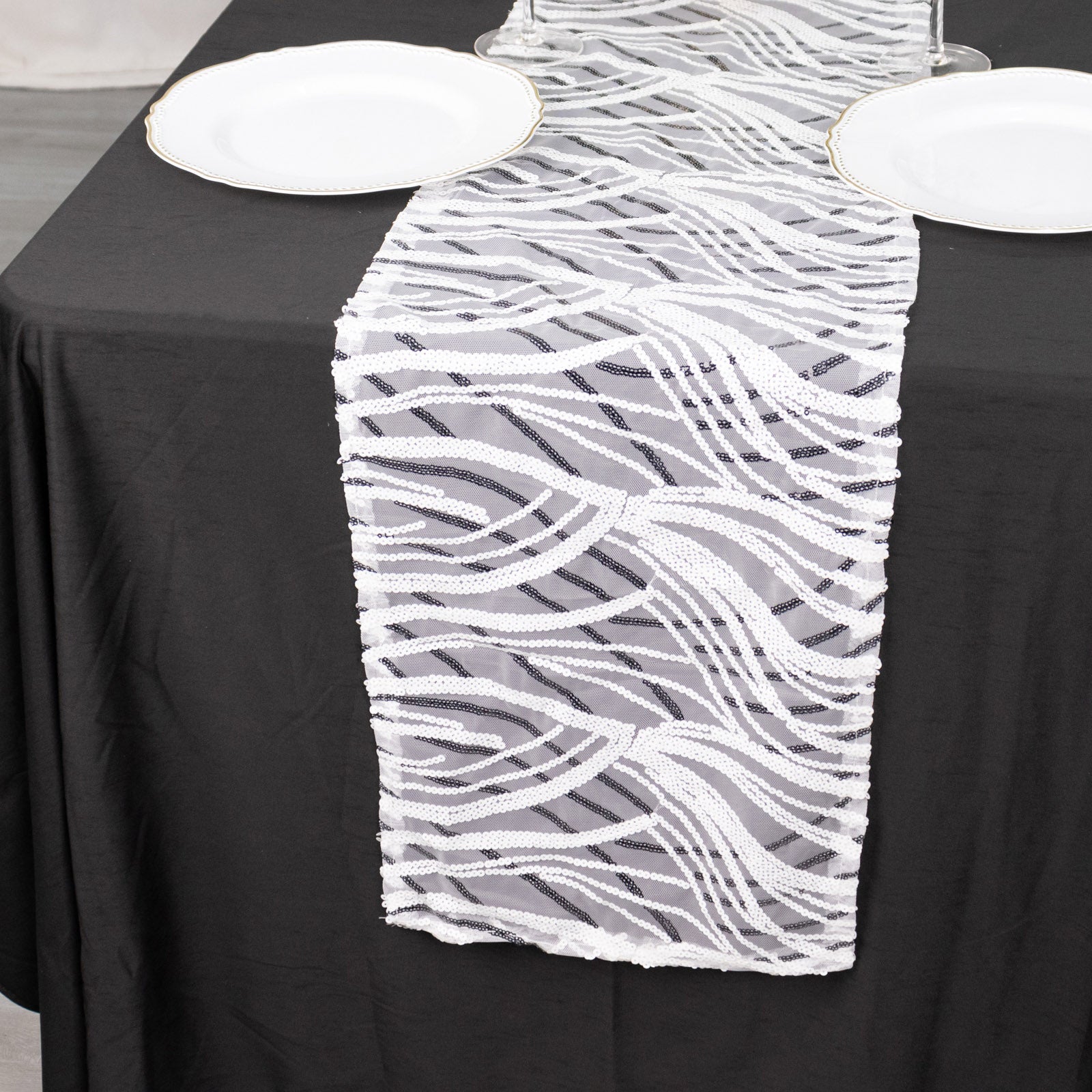 12"x108" White Black Wave Embroidered Sequins Table Runner