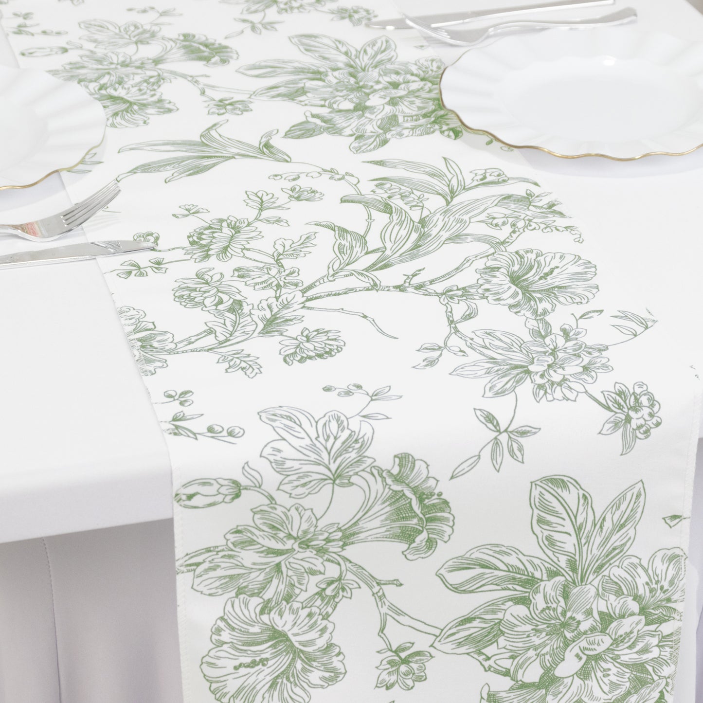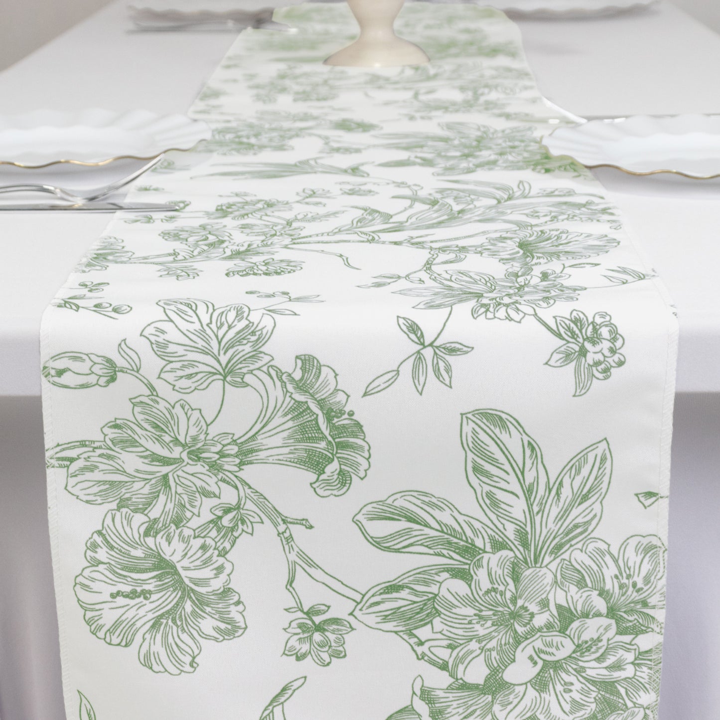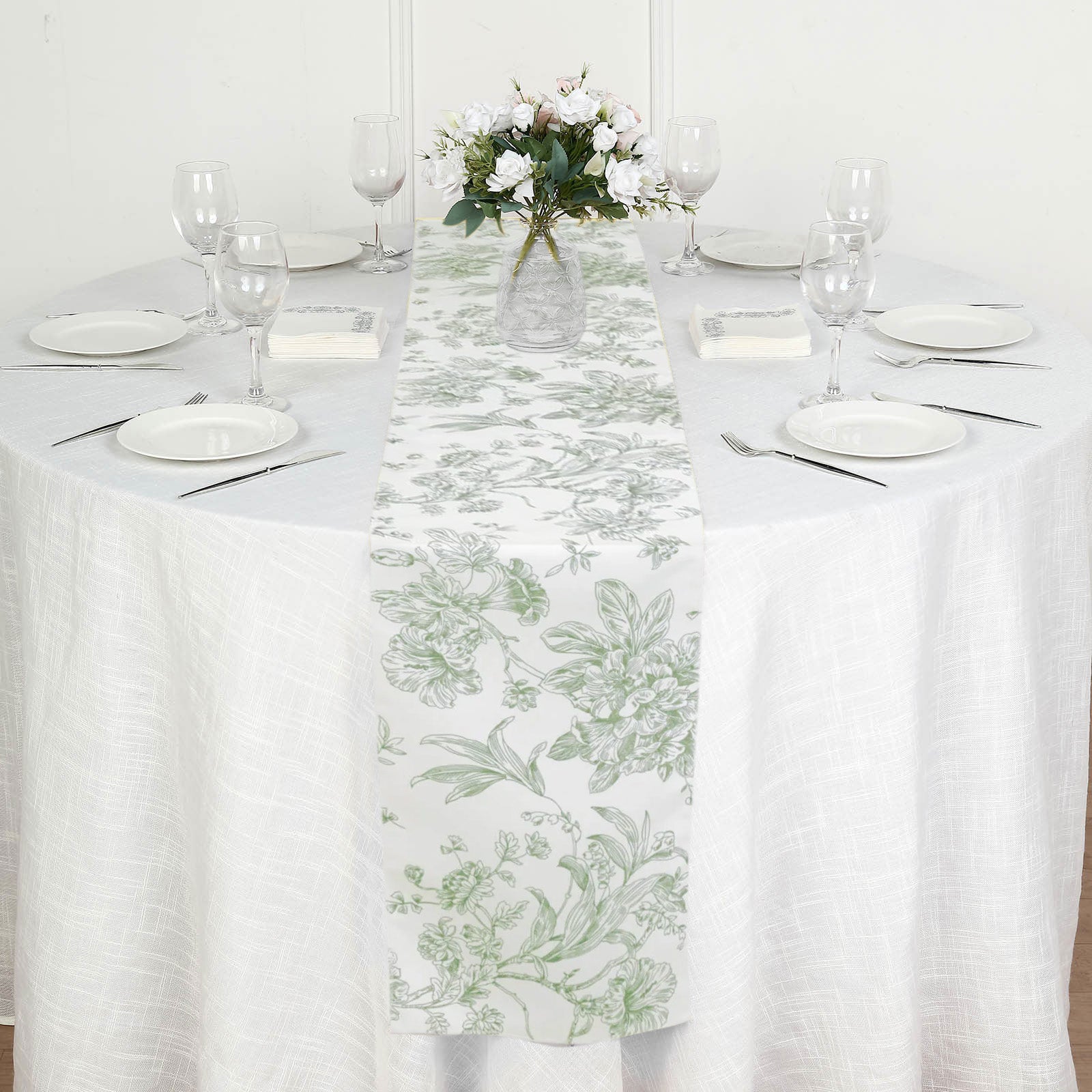Polyester Table Runner 12"x108" White with Dusty Sage Green French Toile Floral Print - Stylish Reusable Table Décor