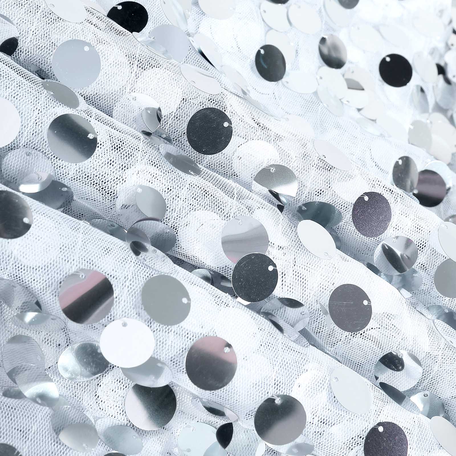 Add brilliance and shine to your décor with this Big Payette Sequin Round Tablecloth in silver. At 132 inches in diameter, it covers 6ft round tables with a floor-length drape. Oversized 19mm sequins sewn on a sturdy mesh base create stunning sparkle, while the seamless one-piece design ensures a flawless finish. Elegant, reusable, and easy to style, this Tablecloth is perfect for weddings, anniversaries, and galas.