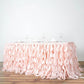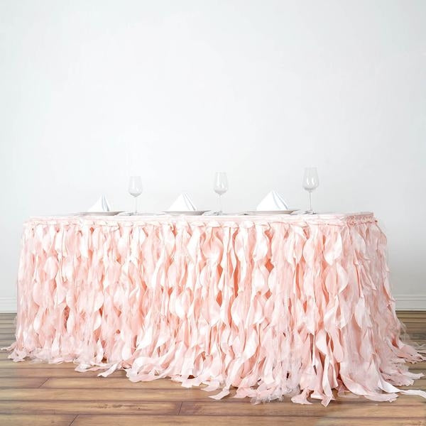 The blush curly willow taffeta table skirt features an elegant design. Its soft blush hue adds sophistication. The cascading ruffles create a whimsical atmosphere for any event.