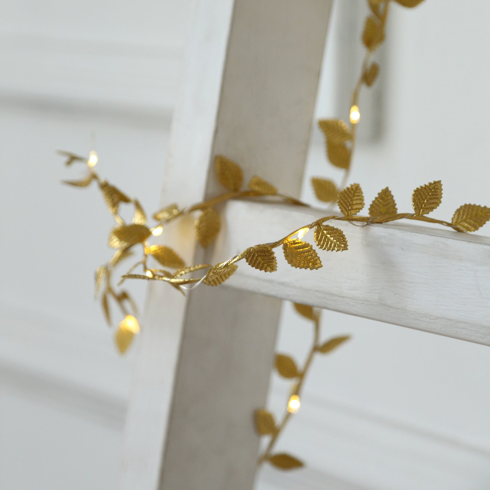 Each garland features exquisite metallic gold rose leaves. These leaves twine gracefully along the vine. The warm white LED lights emit a gentle, soothing glow that enhances any space.
