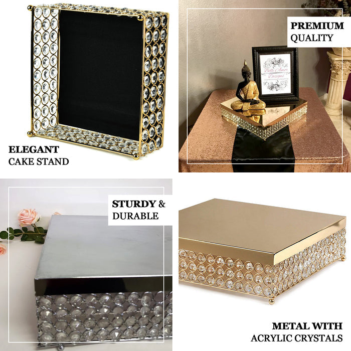 16” Gold Square Crystal Beaded Metal Cake Stand, Dessert Pedestal