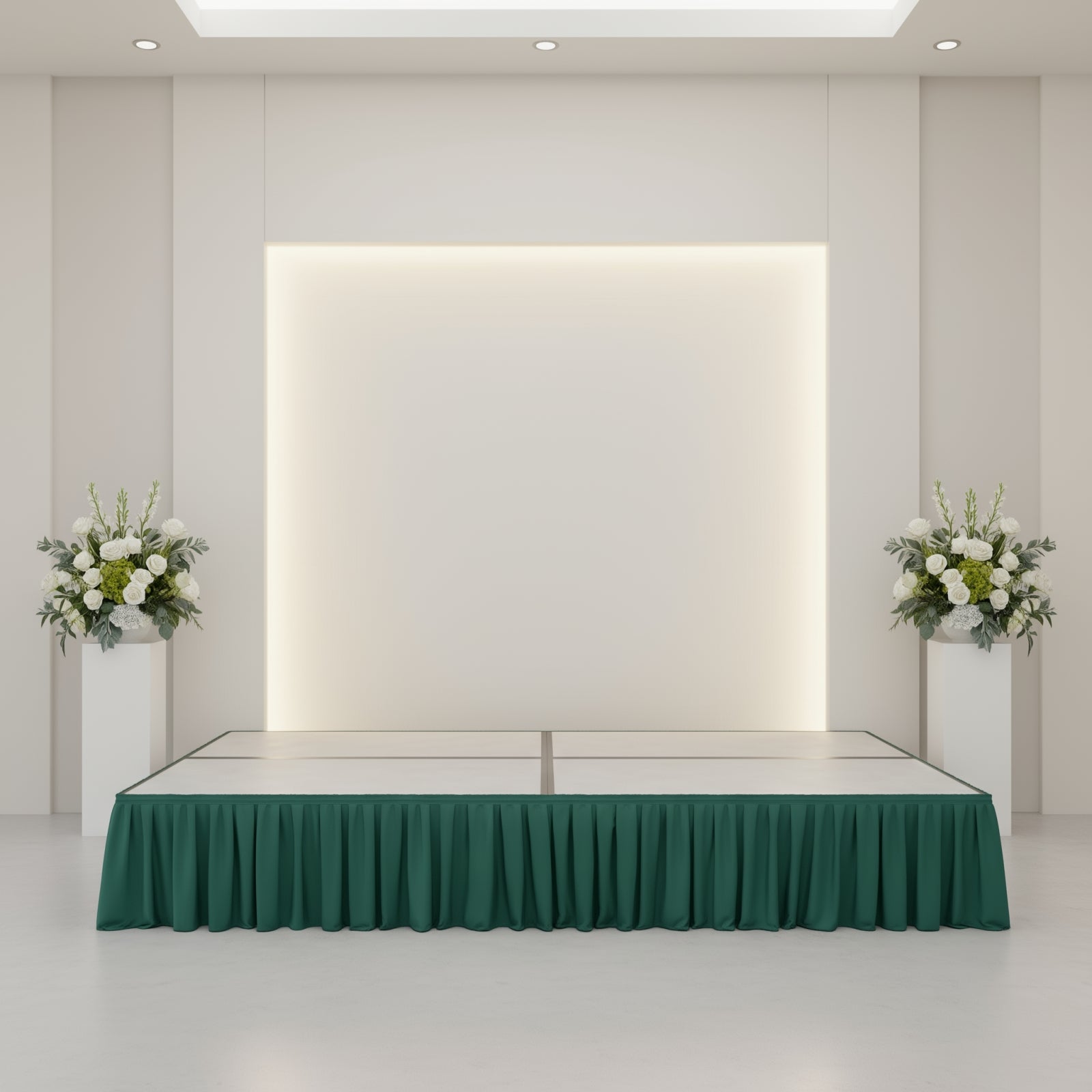 This Hunter Emerald Green skirt pairs effortlessly with a variety of décor pieces like Table Skirts, Backdrop Stands and Covers, and Cloth Napkins. The color blends well with both modern and classic themes, and it works beautifully alongside metallics, neutrals, or bold floral displays. Create a cohesive design from stage to tabletop that’s visually striking and event-ready.