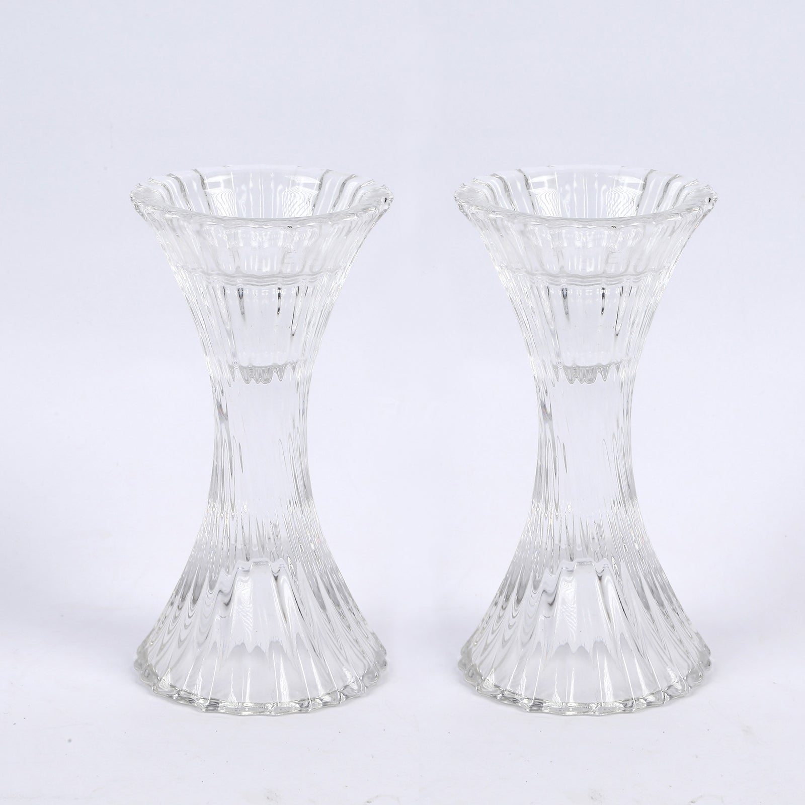 2 Pack | 5" Clear Crystal Hour Glass Taper Candle Holders, Reversible Pillar Candlestick Stands With Diagonal Stripes