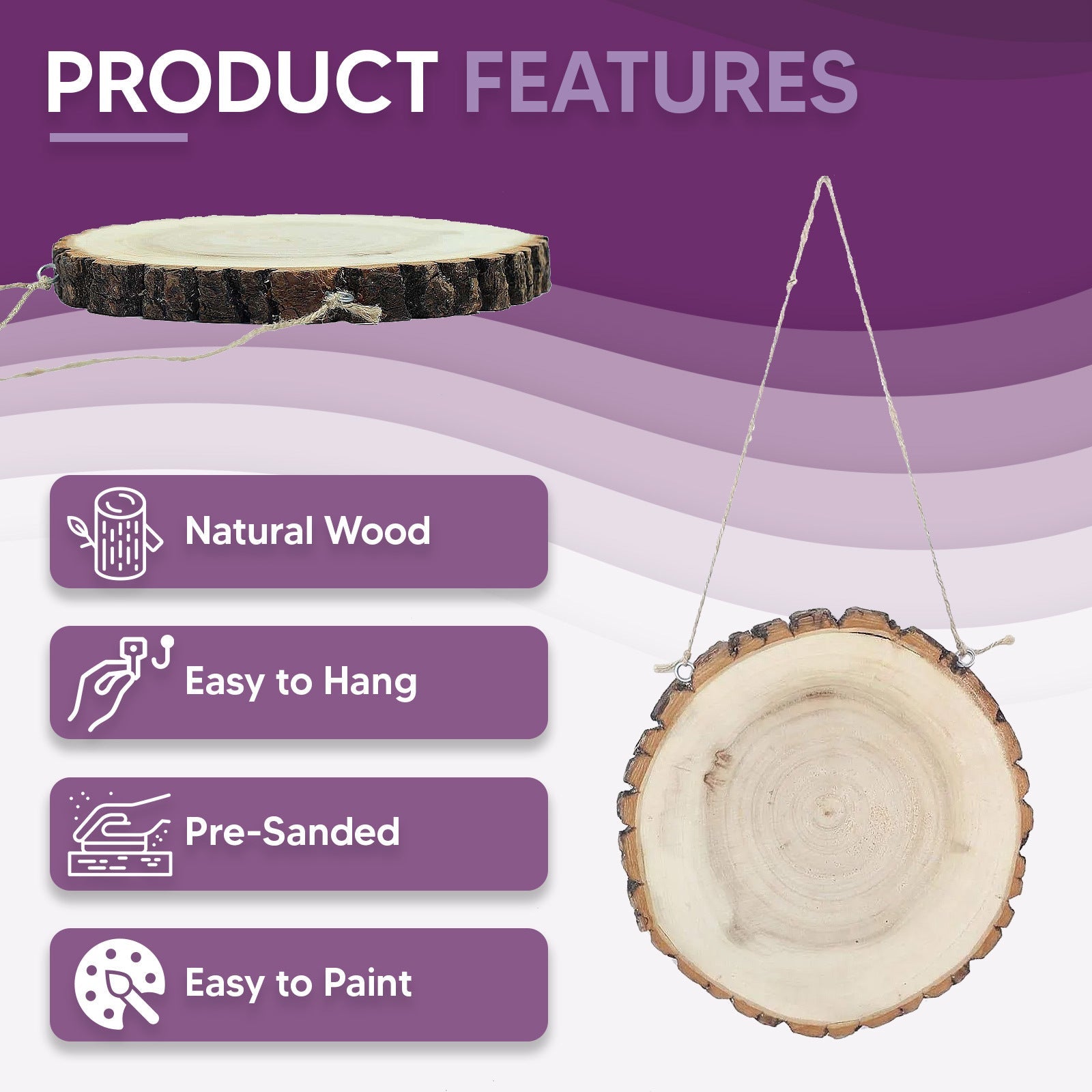 Our Natural Blank Hanging DIY Wood Signs come with natural jute twine for easy hanging. Simply thread the twine through the pre-drilled holes. This makes displaying your creations a breeze, whether indoors or outdoors.