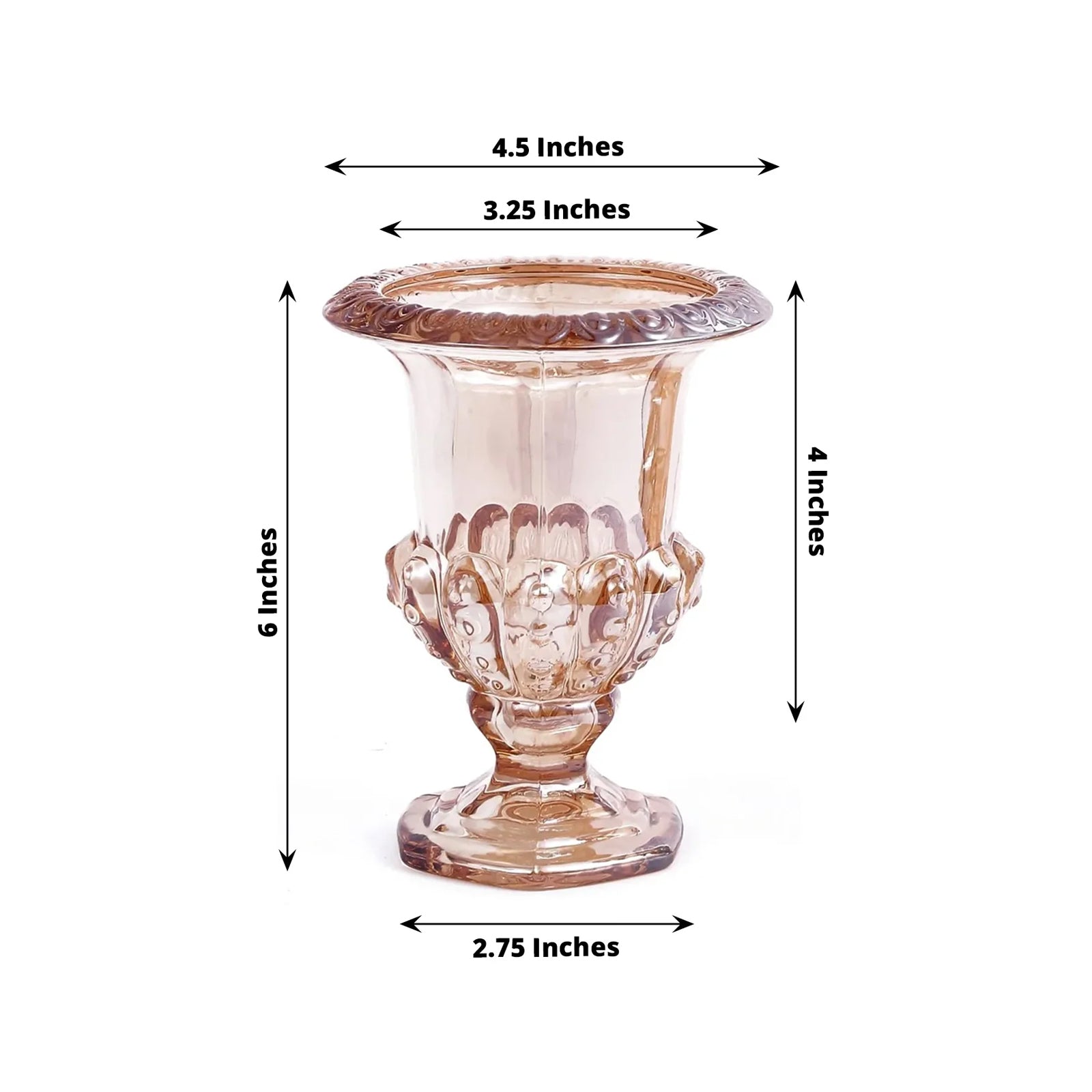 Transform your event decor with our Classic Roman Urn Style Amber Glass Pedestal Vases. These stunning vases stand at 6.5 inches tall, making them ideal for eye-catching table centerpieces. The warm amber hue of the glass creates a beautiful glow, enhancing the ambiance of any setting. Their exquisite craftsmanship reflects a classic design that adds timeless elegance.
