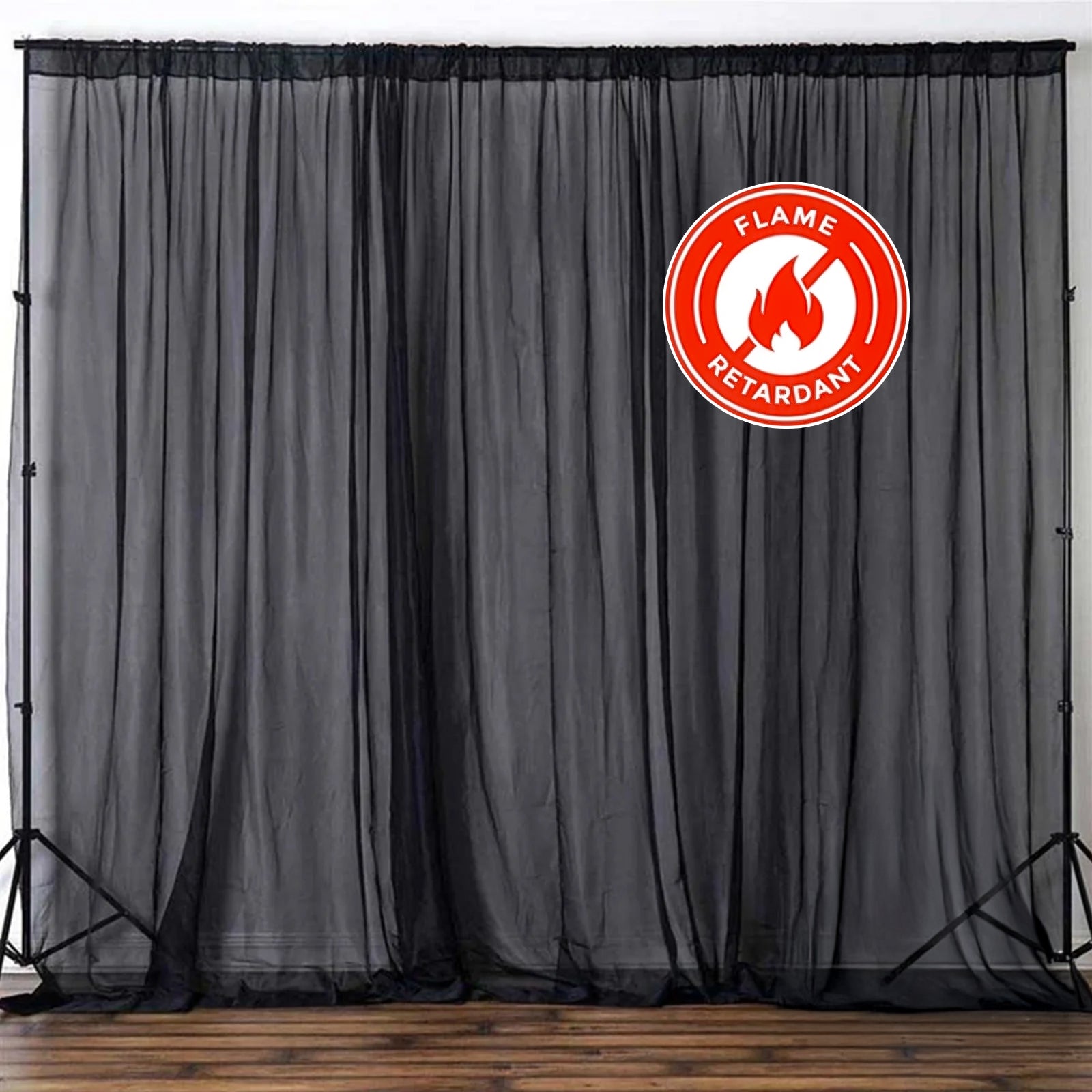 Our 2 Pack Black Sheer Chiffon Event Curtain Drapes add elegance to your event. These curtains are crafted from premium chiffon, offering a delicate and sophisticated look. Their sheer quality allows soft light to filter through, creating a warm ambiance that enhances the atmosphere of any gathering.