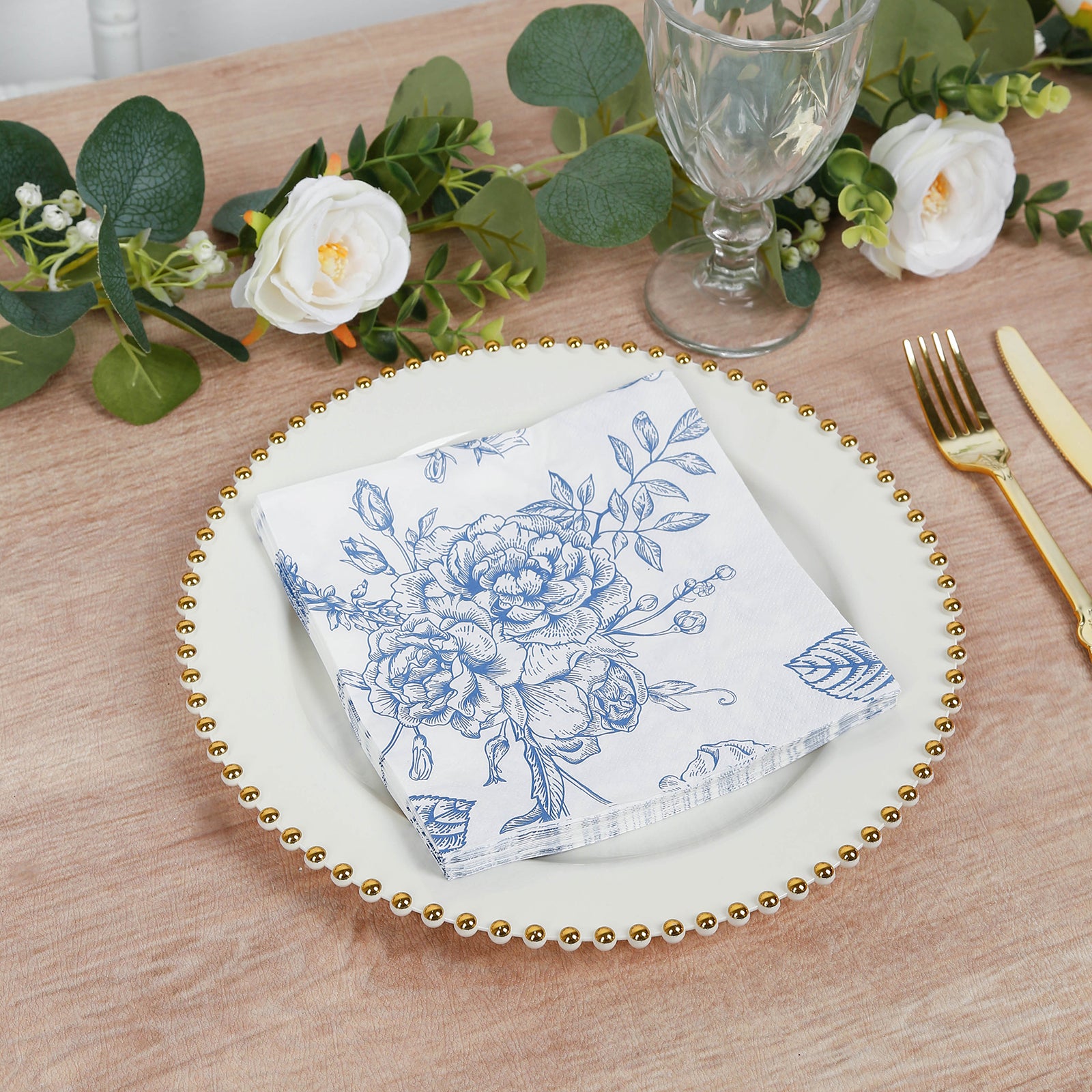 50 Pack 2-Ply Paper Beverage Napkins in Matte Blue and White French Toile Floral Pattern, Highly Absorbent Soft Disposable Cocktail Napkins