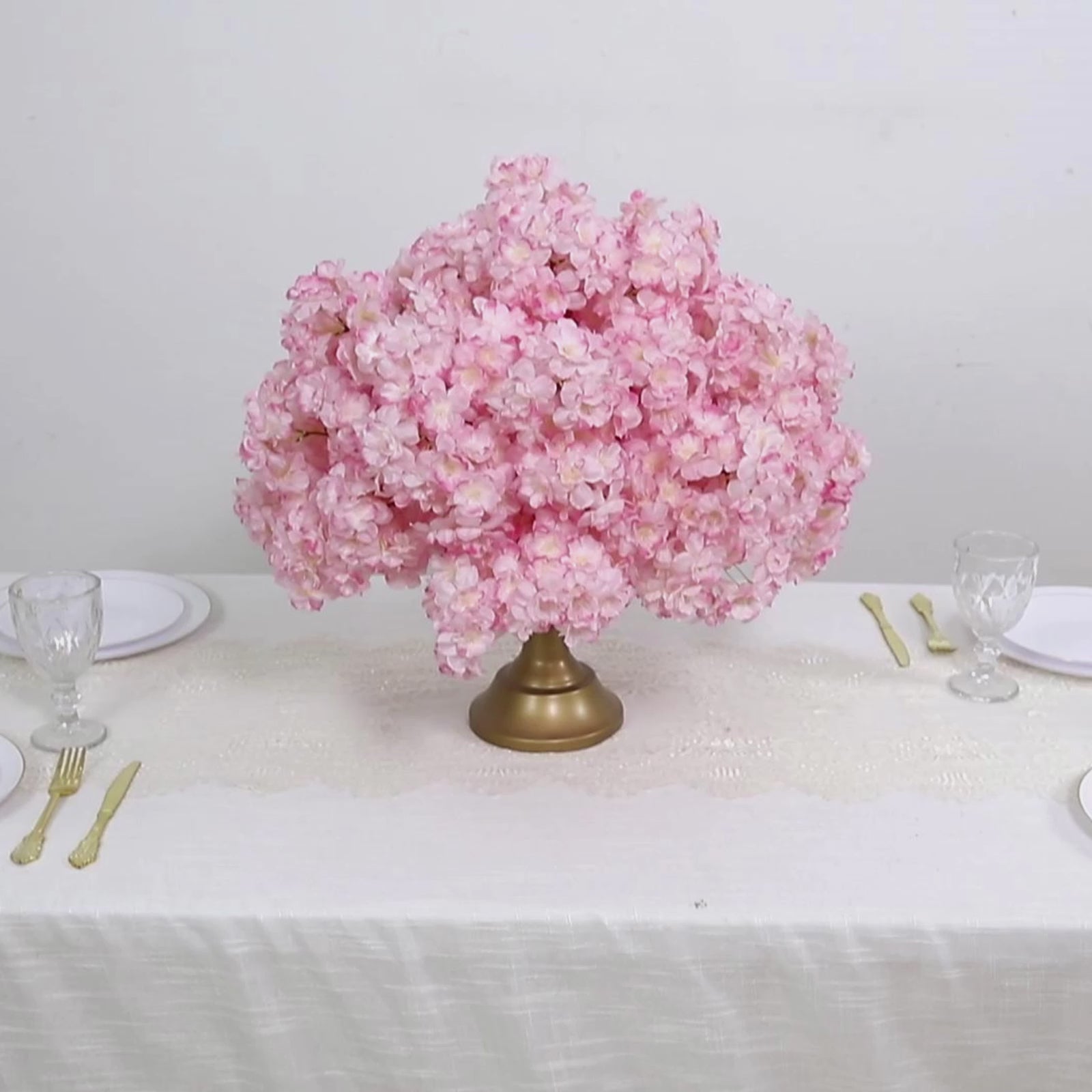 Bring a touch of sophistication to your event with this pre-arranged artificial cherry blossom centerpiece from TCF Linen. Measuring 20" in diameter and 13" in height, the blush silk flower ball sits securely on vases, tables, or pedestal stands due to its flat foam base. Crafted from high-quality silk and wire, the flowers maintain their shape and delicate blush tone over time. Ideal as a wedding table centerpiece or event floral arrangement, this round flower centerpiece complements a wide variety of table settings. Combine it with Table Linens and décor accents for a refined, coordinated look.