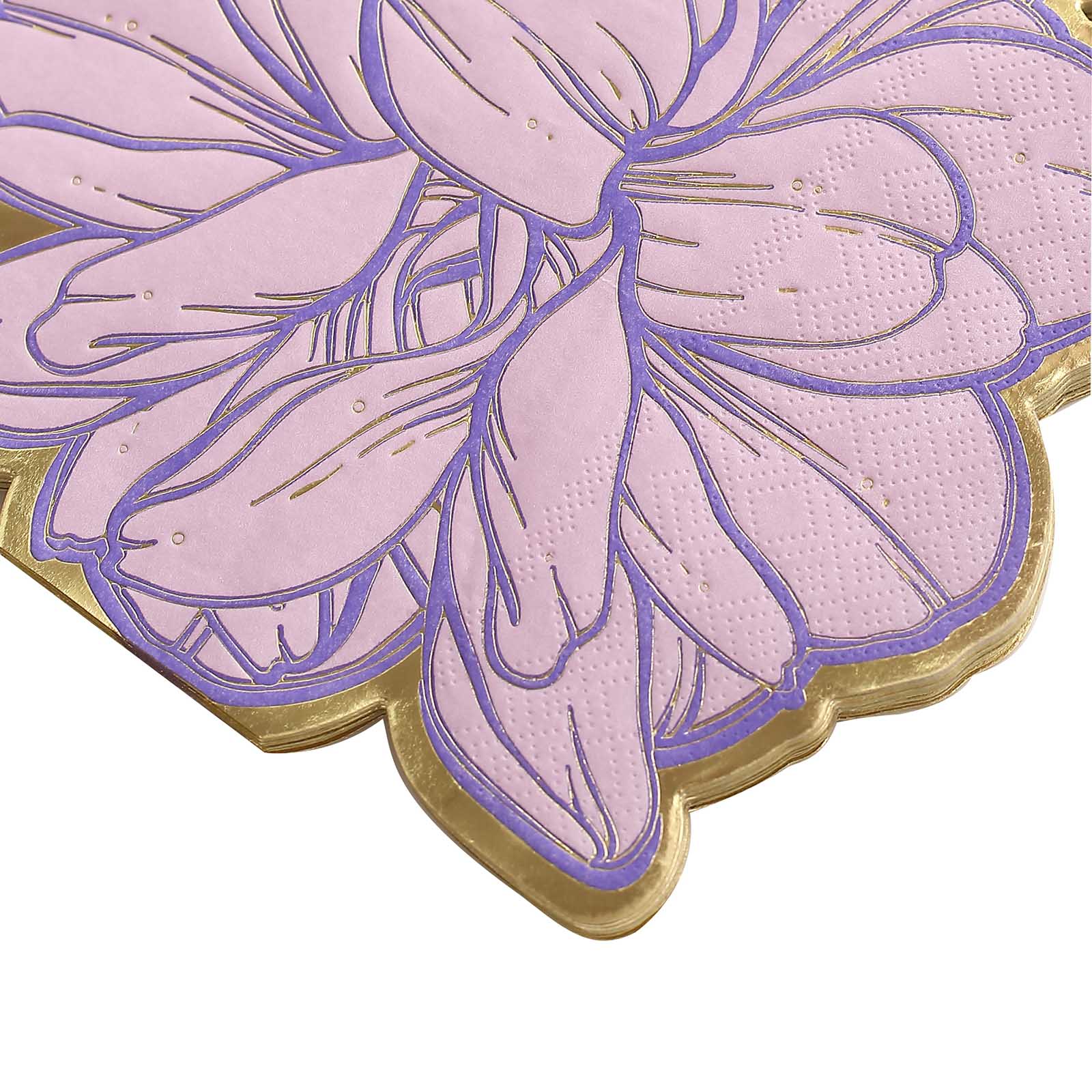 20 Pack Purple Peony Flower Shaped Paper Cocktail Napkins with Gold Edges, Disposable Party Beverage Napkins