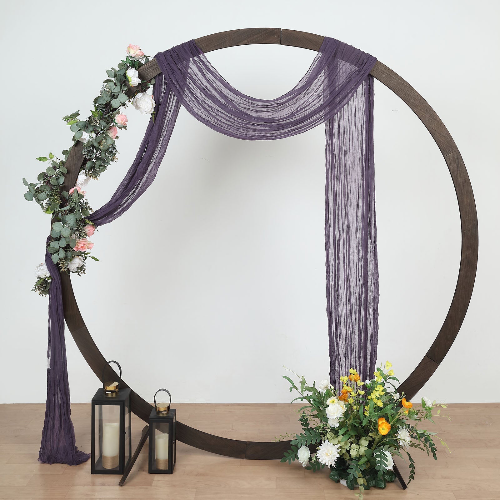 Transform your wedding arch with our Purple Gauze Cheesecloth Drapery. This fabric drapes beautifully, creating an enchanting atmosphere. The rich purple hue enhances any decor, making it a stunning focal point for your ceremony.