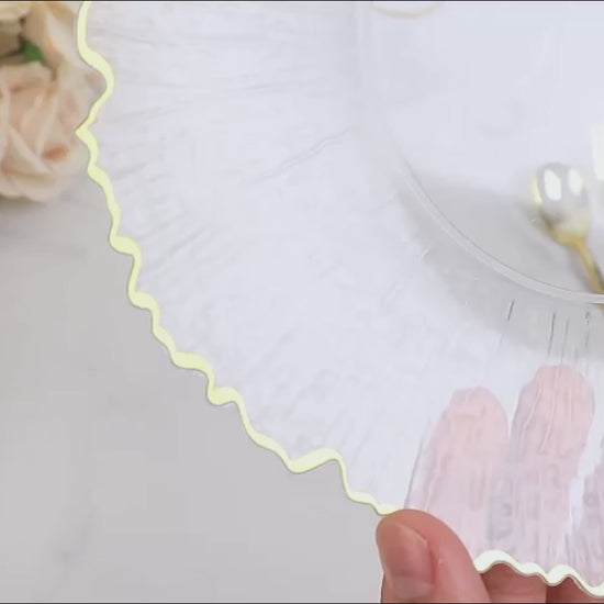 Create a polished and coordinated table setting with this 20 pack of 7" plastic dessert plates. Made from sturdy plastic and finished with a reef-inspired edge, each plate features a crystal-clear center accented by a radiant gold rim. At 7 inches in diameter, these plates are just the right size for cakes, pastries, fruit, or savory hors d’oeuvres. The reef design enhances presentation, giving every dish a refined backdrop that feels party-ready. Durable yet lightweight, these gold rim party plates bring the charm of upscale dinnerware with the convenience of disposables.