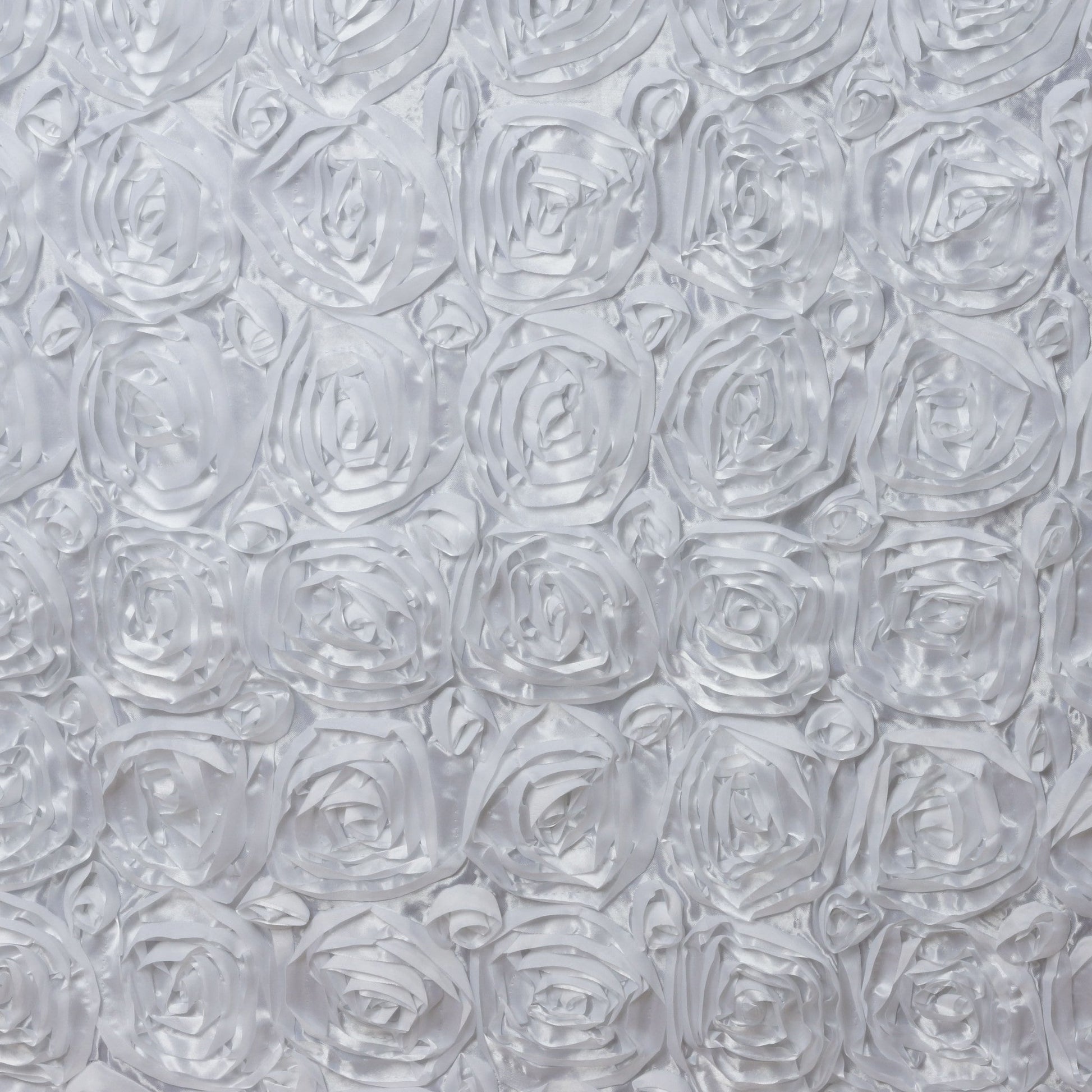 The 21ft White Rosette Table Skirt features an exquisite 3D design. Each satin rose is handcrafted. This creates a stunning visual effect that adds depth to your decor.