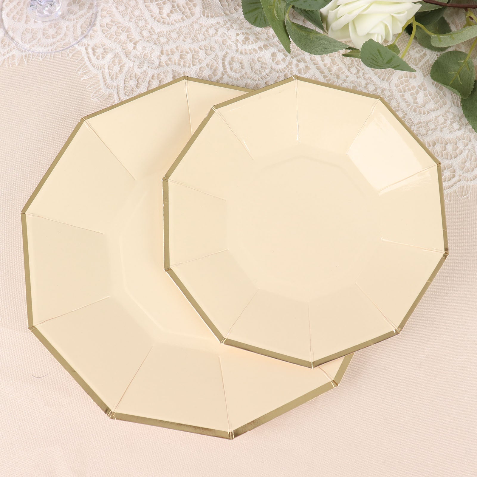 25 Pack | 7" Beige Gold Foil Rim Geometric Appetizer Paper Plates, Decagon Dessert / Salad Plates