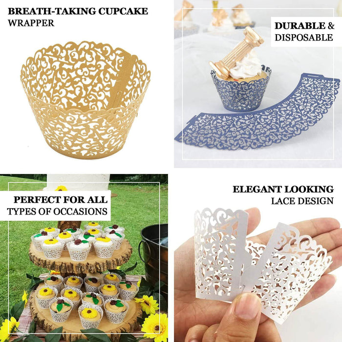 25 Pack | Ivory Lace Laser Cut Paper Cupcake Wrappers, Muffin Baking Cup Trays