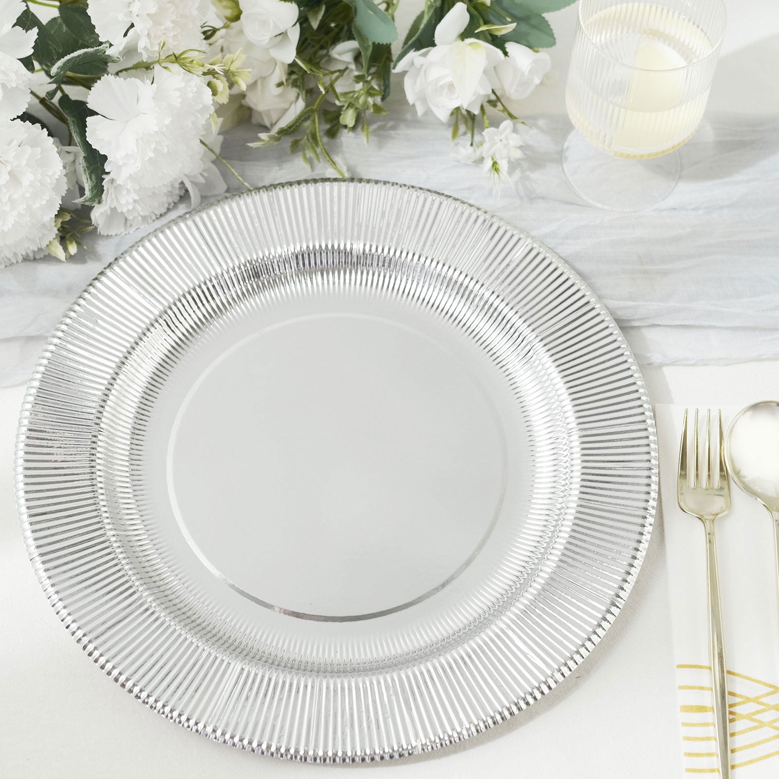 25 Pack | Sunray Metallic Silver 13" Disposable Charger Plates, Cardboard Serving Tray, Round - 350 GSM