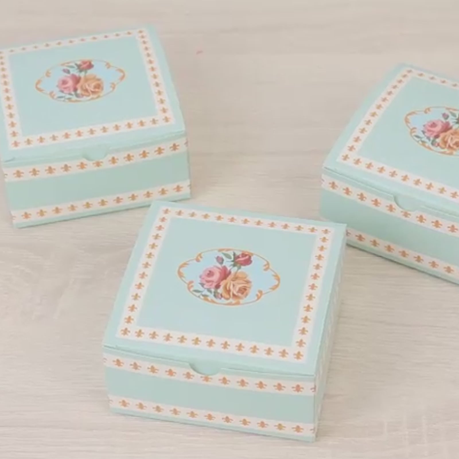 These floral favor boxes feature a delicate rose print, bringing a timeless and romantic feel to your event decor. The soft turquoise color complements a variety of table settings, making them a versatile choice for any theme. Whether paired with lace table runners or modern decor, these elegant boxes create a refined and graceful aesthetic.
