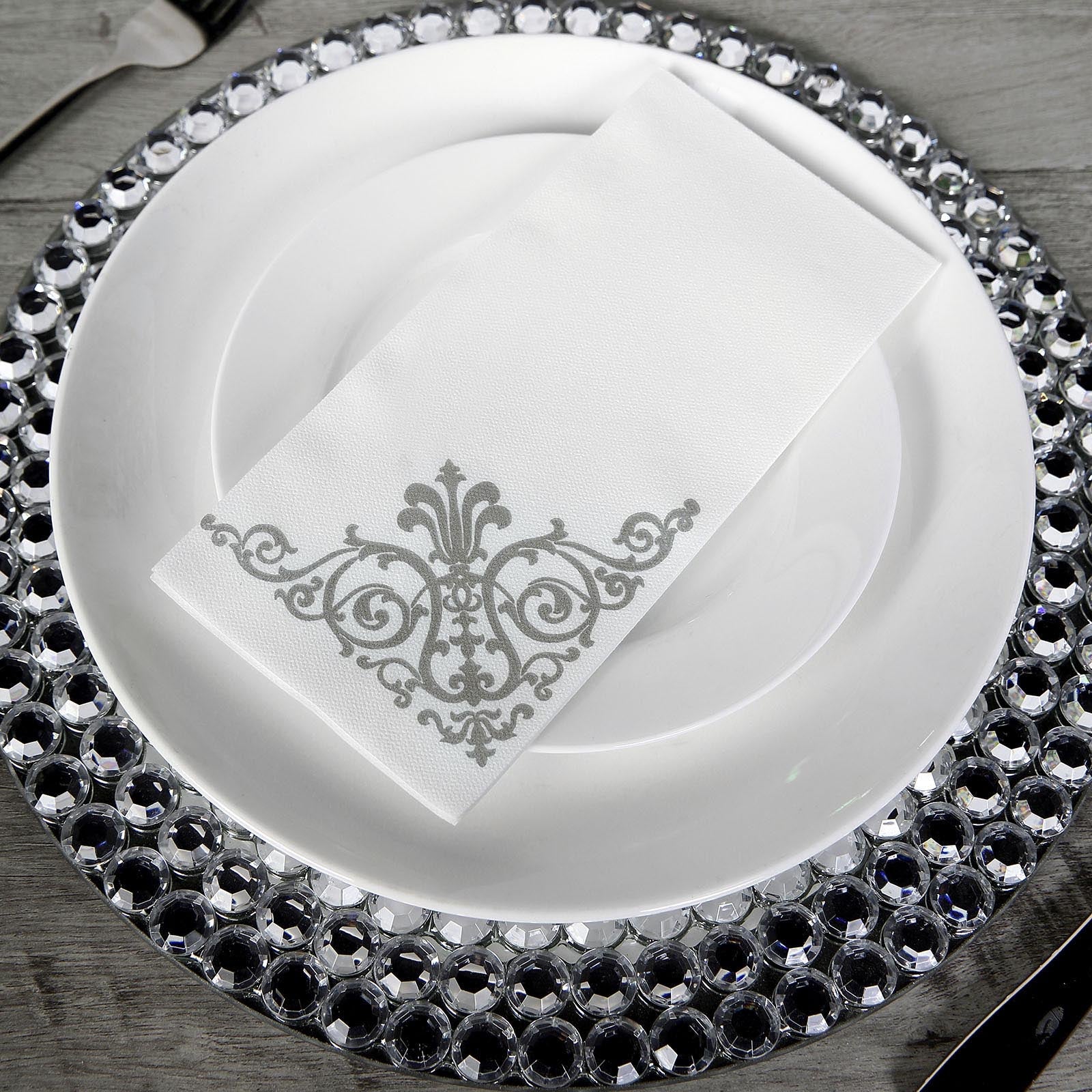 25 Pack White Linen-Feel Paper Napkins with Silver Fleur Vintage Print, Premium Cloth-Like Airlaid Dinner Napkins, Disposable Soft and Absorbent Guest Towels