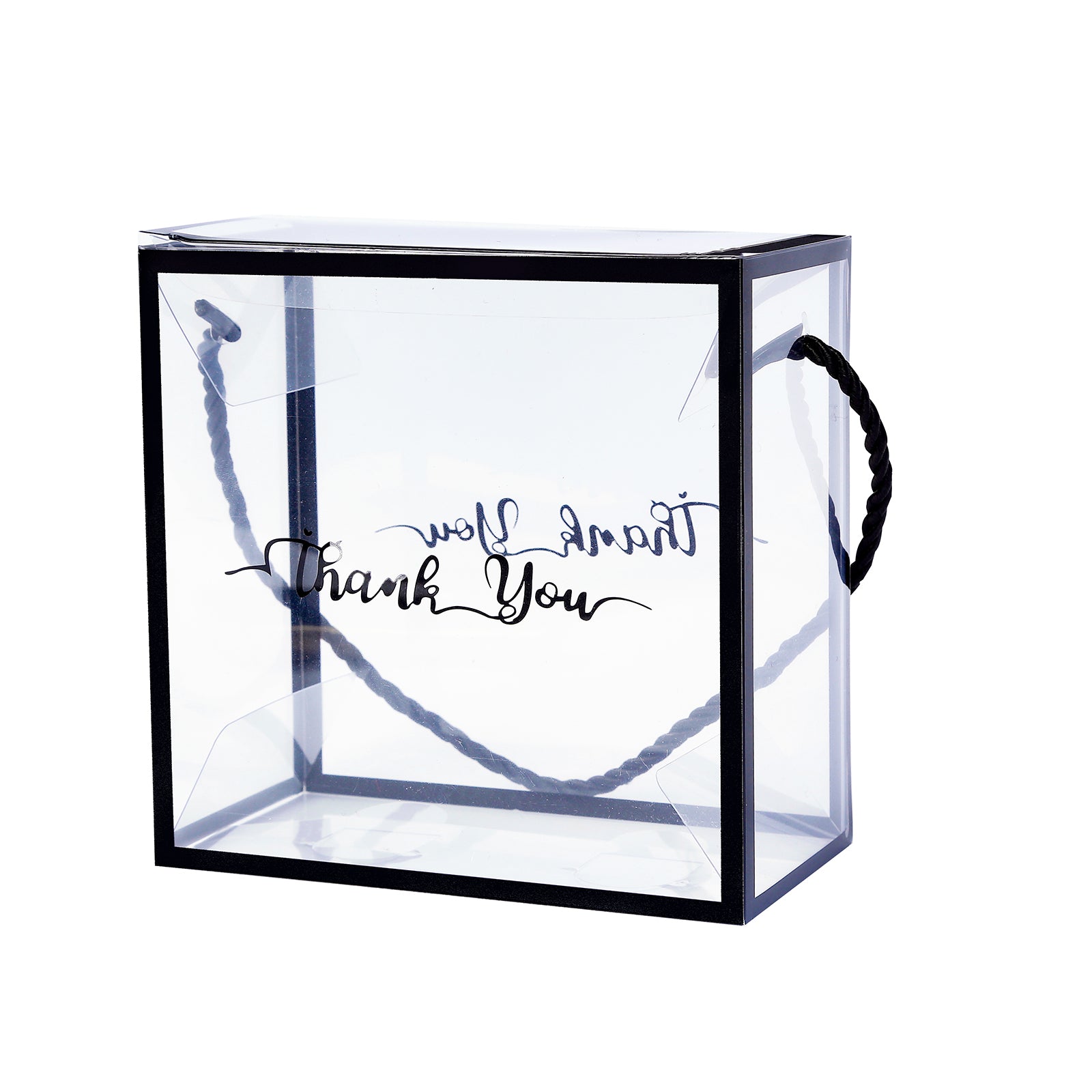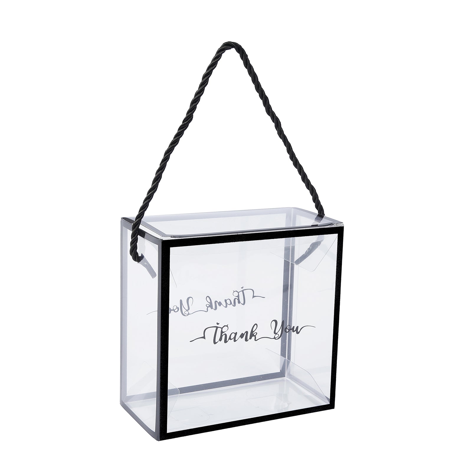25 Pack Clear PVC Gift Boxes with Black Edge Rope Handles and Thank You Print, Transparent Portable Candy Favor Boxes - 5.5"x5.5"